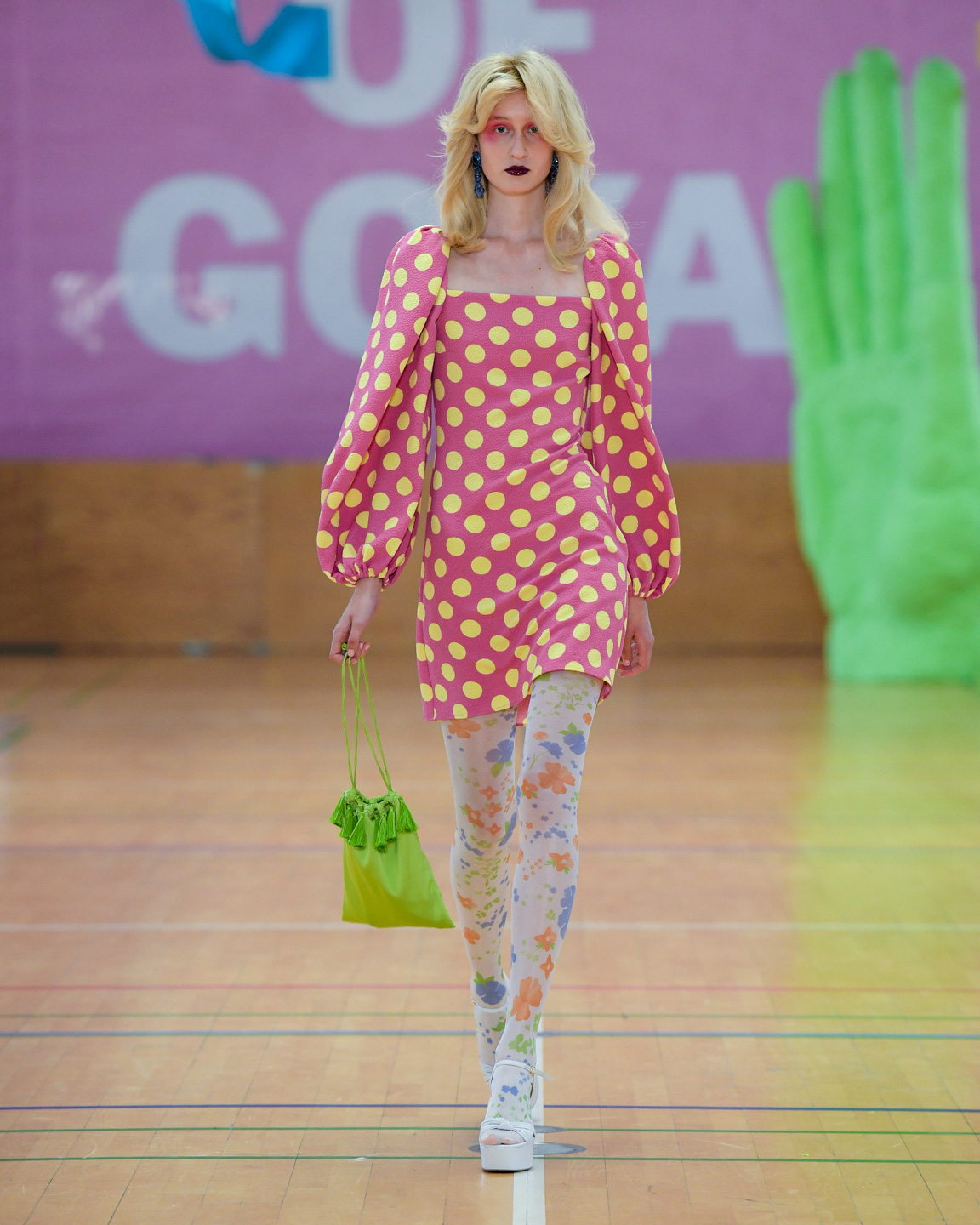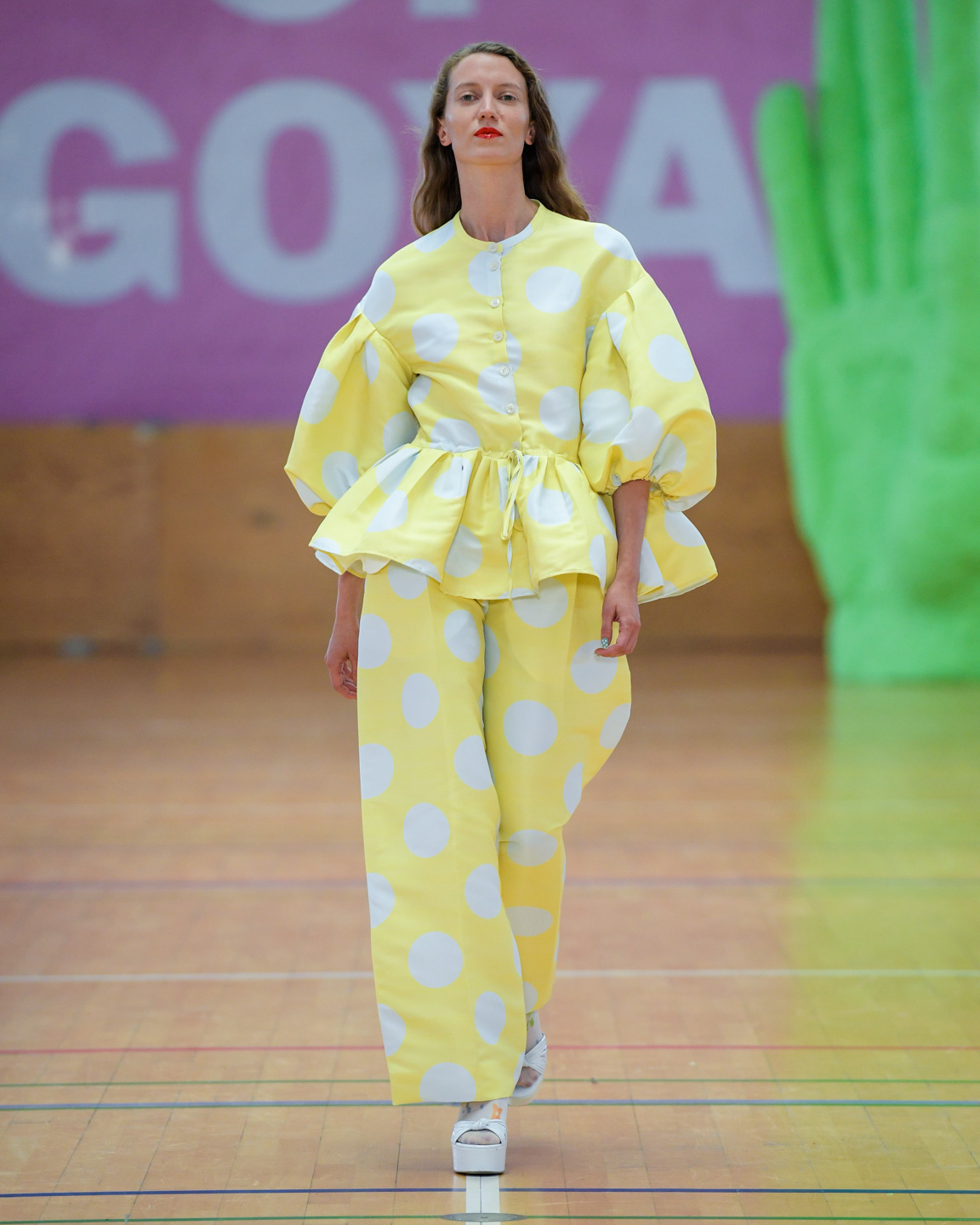 Die Kollektion selbst zeigte sich laut, von modischer Zurückhaltung keine Spur. Stattdessen setzte das dänische Label noch einen drauf, zog Polka Dots in übergroße Dimensionen, versprühte Knall- und Bonbonfarben in Grün, Pink und Orange und setzte alledem mit Herzchenprints und Blumenmuster ein Schleifchen auf. Geht es nach Stine Goya darf es im kommenden Frühlung und Sommer also möglichst extravagant, möglichst bunt werden, vor allem aber darf es dabei mindestens genauso viel Spaß machen, wie ihre Modenschau in Kopenhagen.