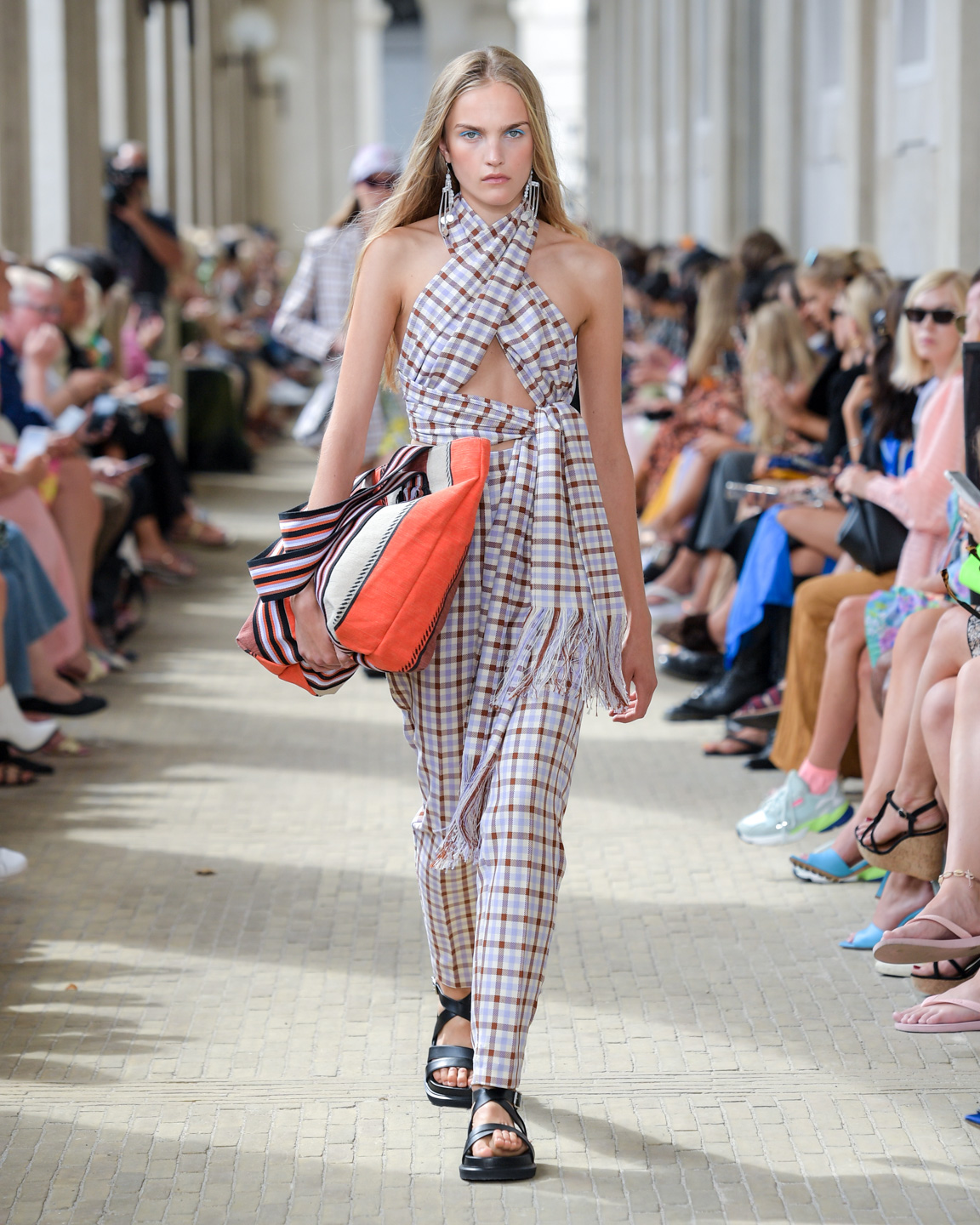 Am Donnerstagmittag lud Lala Berlin in die Außenanlagen des Schlosses von Christiansborg, um ihre Spring Summer 2020 Kreationen zu präsentieren. Für die Kollektion, die unter dem Titel „Lala Island“ steht, setzte Leyla Piedayesh vor allem auf Patchwork aus verschiedensten Musterungen und Farben, die sich letztlich wieder zu einem Ganzen fügen – ein Aspekt, mit dem die Designerin die Verschmelzung verschiedenster Kulturen symbolisieren möchte. Und trotz der schweren Thematik zieht sich eine Leichtigkeit durch die Kollektion, die durch die fließenden Stoffe und lockeren Schnitte der Maxikleider und langen Hosen getragen wird. Immer wieder werden auch Blazer in karierten, lilafarbenen und verzierten Ausführungen präsentiert. An den Füßen trugen die Models meist derbe, schwarze Sandalen, die den filigranen Entwürfen einen Bruch entgegenbrachten und einmal mehr bewiesen, dass vermeintlich Unterschiedliches doch ganz wunderbar zusammen passt.