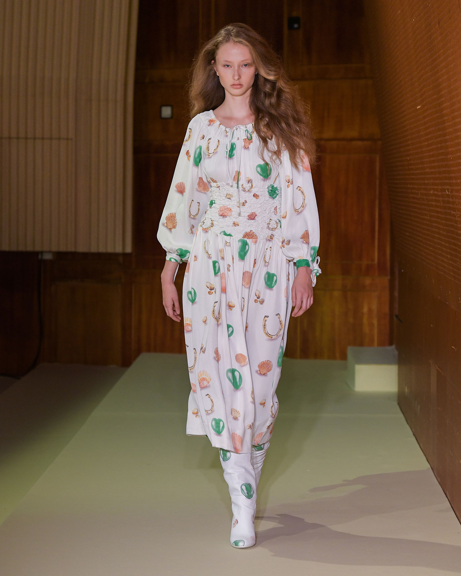 Saks Potts wusste bereits mit der Location zu beeindrucken: Der Konzertraum der Royal Danish Academy of Music war in schummeriges Licht gehüllt, auf der Bühne waren die Sitzplätze für ein kleines Orchester bereitgestellt. Irgendwann dann, als auch die letzte Person verstummt war, erklangen die Töne der Interstellar-Filmmusik von Hans Zimmer und hinterließen mal eben so (zumindest bei mir) jede Menge Gänsehaut. Mit einem musikalischen Umschwung schritten schließlich auch die ersten Models über die Bühne, führten ihren Weg durch die Gänge, bis hoch auf den Balkon fort. Die rüschenden Maxiröcke, Cowboy Boots und Westerngürtel ließen die Inspiration durch spanische und hispanische Frauen, allen voran durch die ikonische Sängerin Selena Quintanilla-Pérez, schnell erkennen.