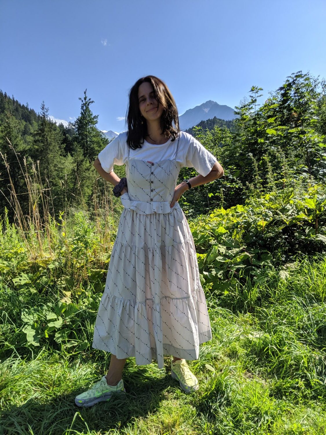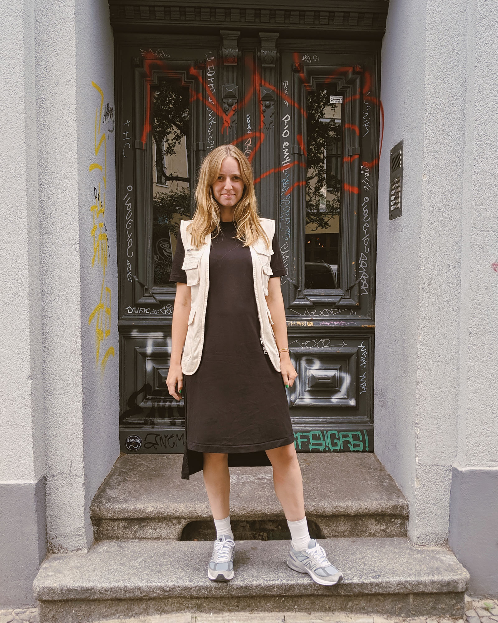 Rechts: Kleid von COS, Weste von & Other Stories, Schuhe von New Balance