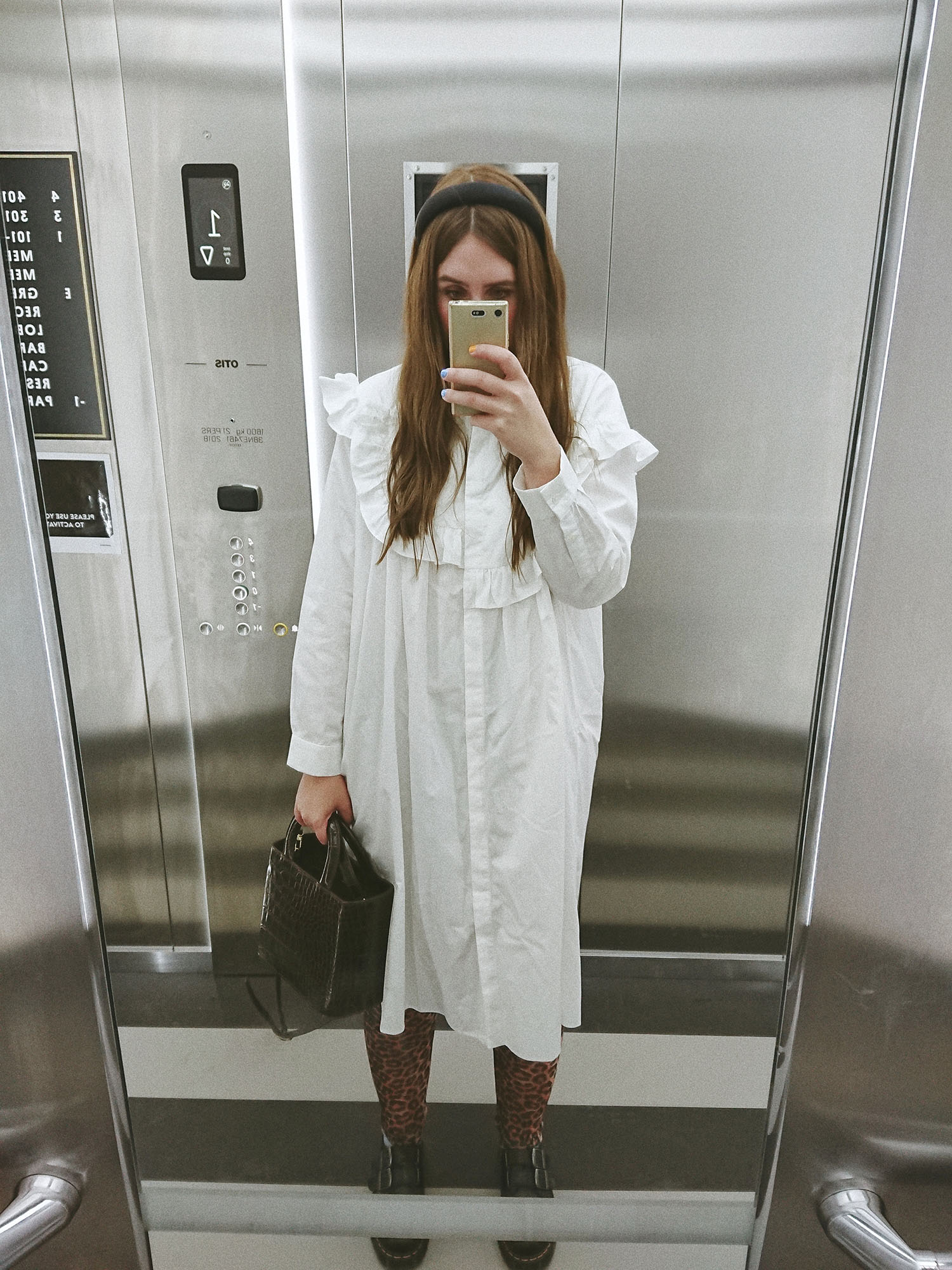Kleid: Ganni, Sneaker: Nike P-6000, Tasche: Acne Studios