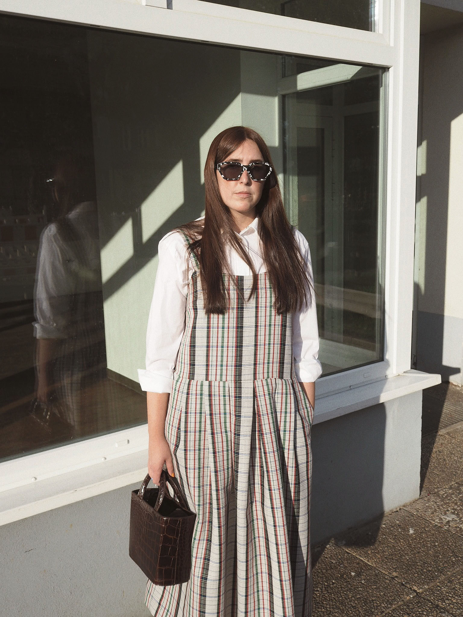 Links: Kleid von Shrimps (ausverkauft), Hemd von Calvin Klein, Sonnenbrille von Prada, Tasche von Staud (ausverkauft)