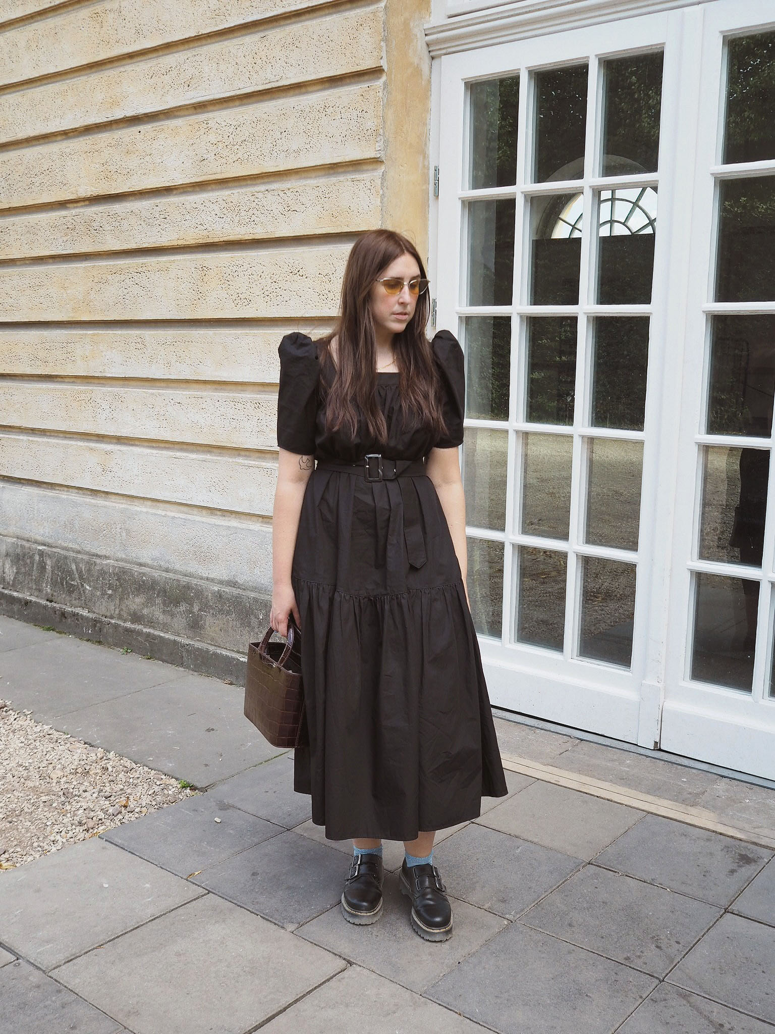 Kleid von Pixiemarket, Sonnenbrille von Marc Jacobs, Schuhe von Dr. Martens, Tasche von Staud (ausverkauft)