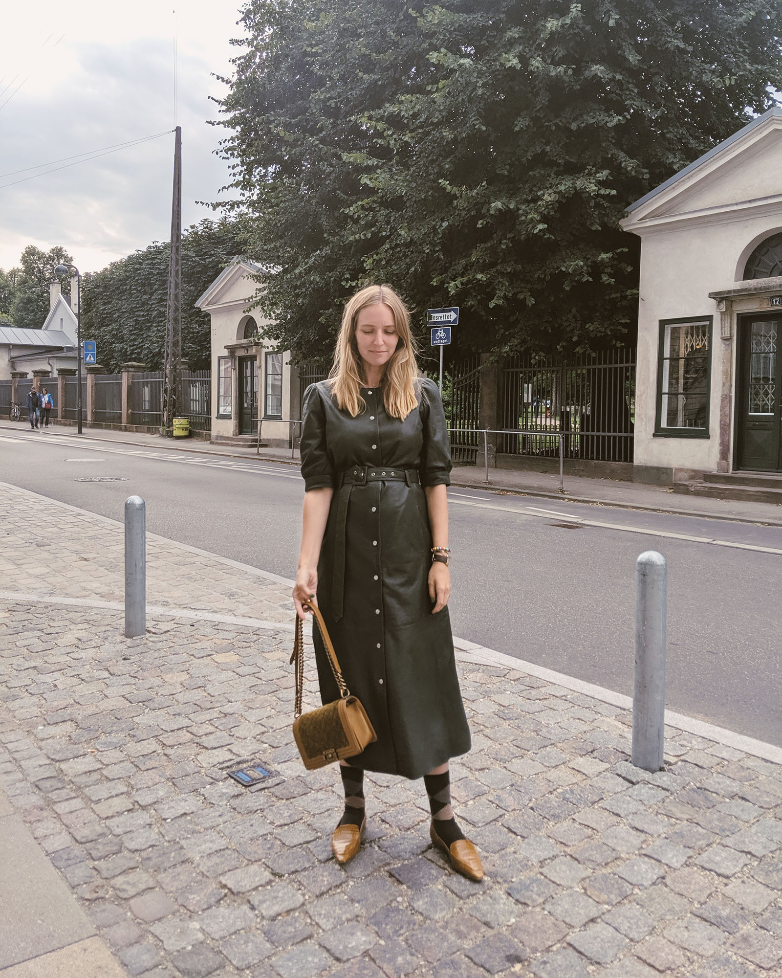 Kleid von Ganni (coming soon), Schuhe von Ganni, Tasche von Chanel via Vestiaire Collective, Ohrringe von Folkdays x This is Jane Wayne