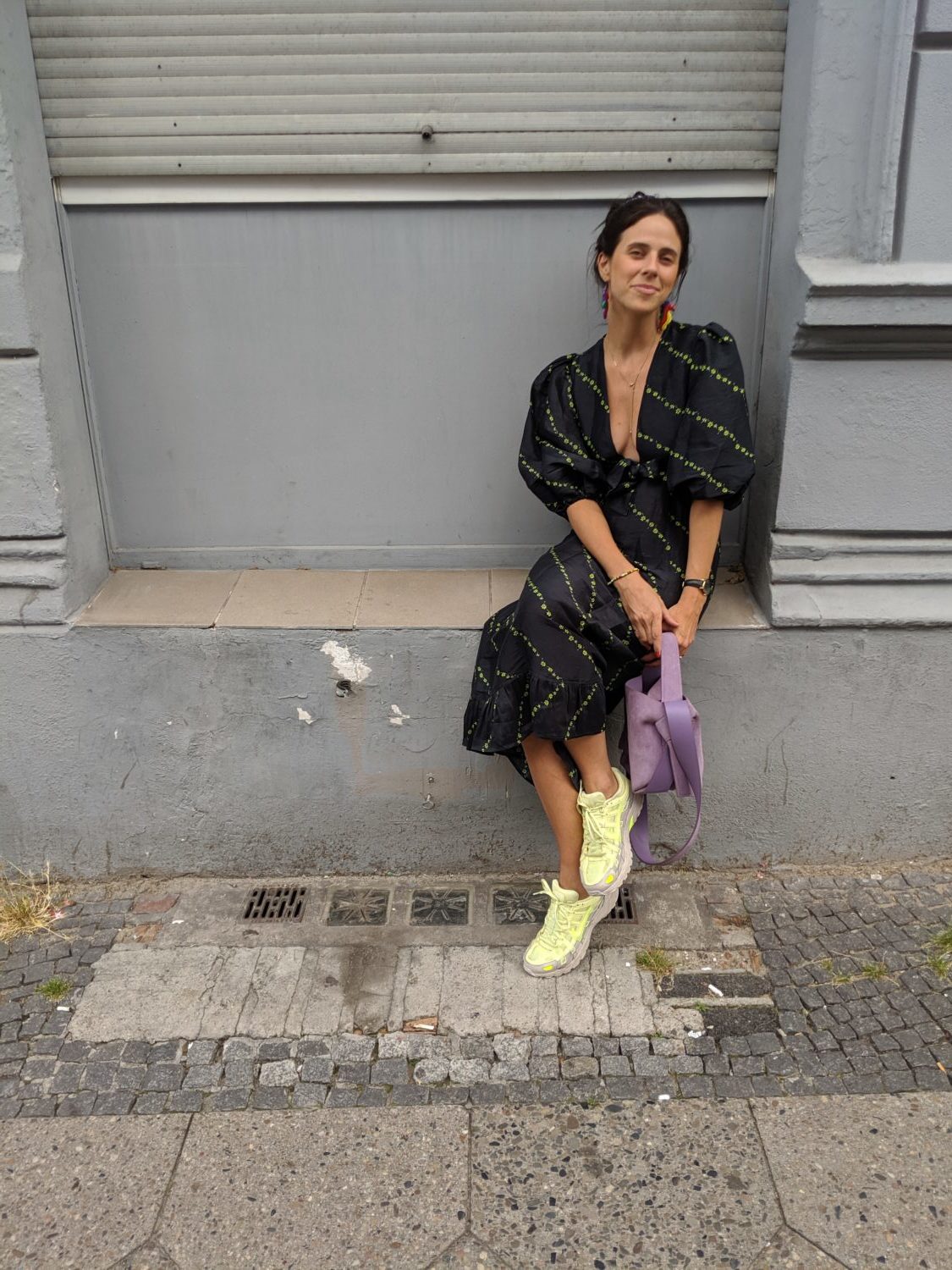 Kleid: Ganni, Sneaker: Nike P-6000, Tasche: Acne Studios
