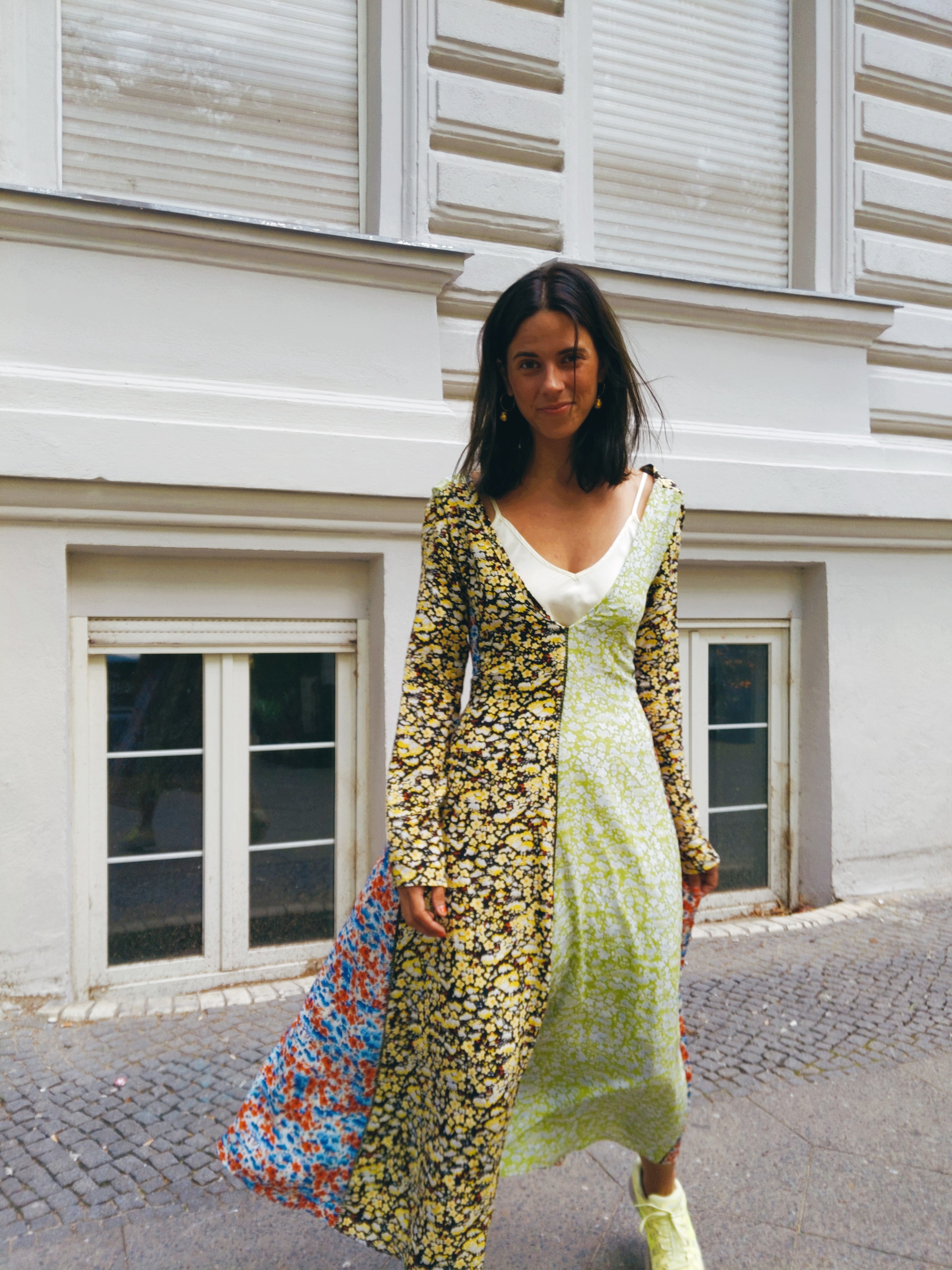 Kleid von Gestuz, Tasche von Chanel via Vestiaire Collective, Schuhe von Aeyde