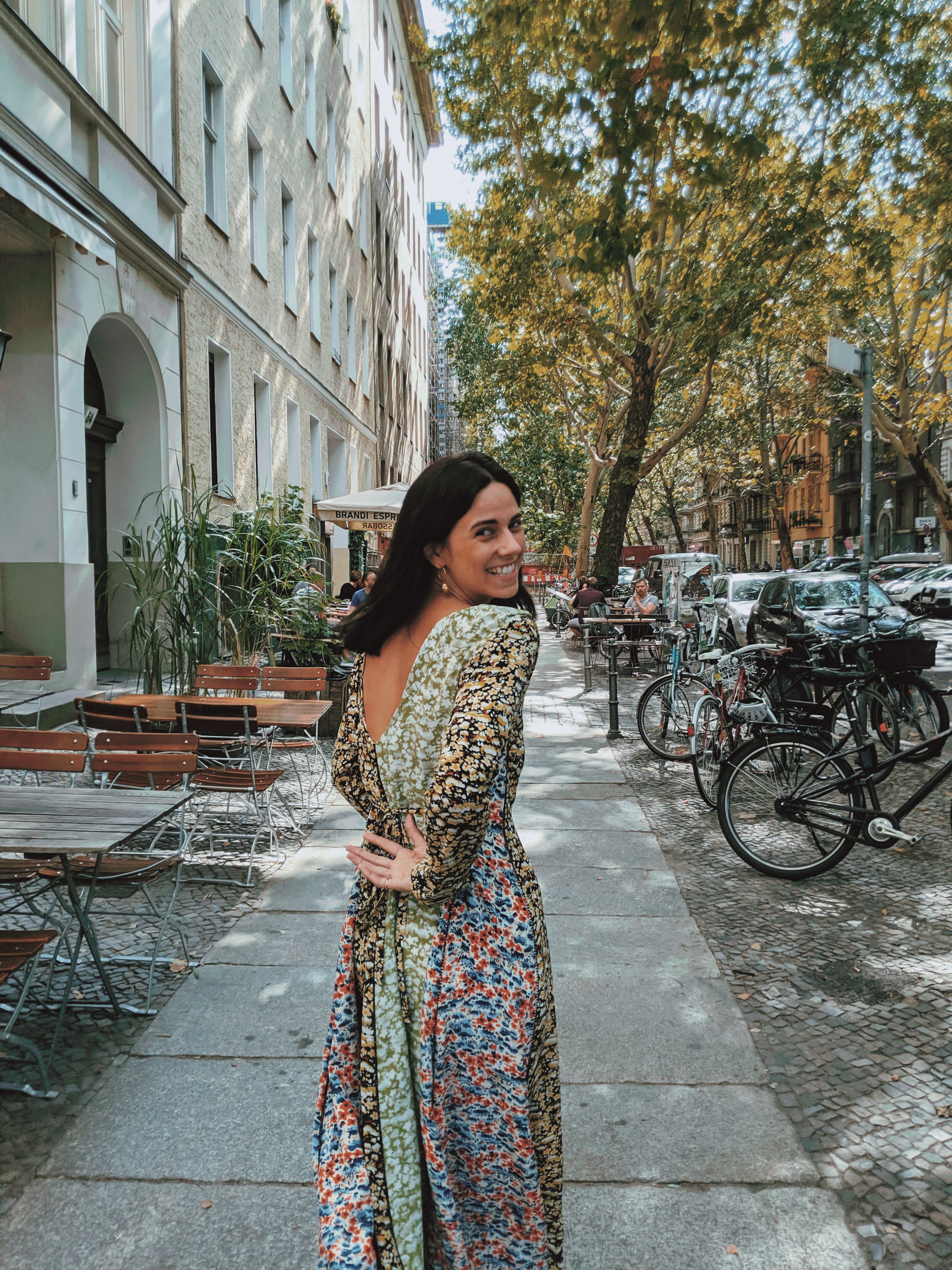 Kleid von Ganni (coming soon), Schuhe von Ganni, Tasche von Chanel via Vestiaire Collective, Ohrringe von Folkdays x This is Jane Wayne