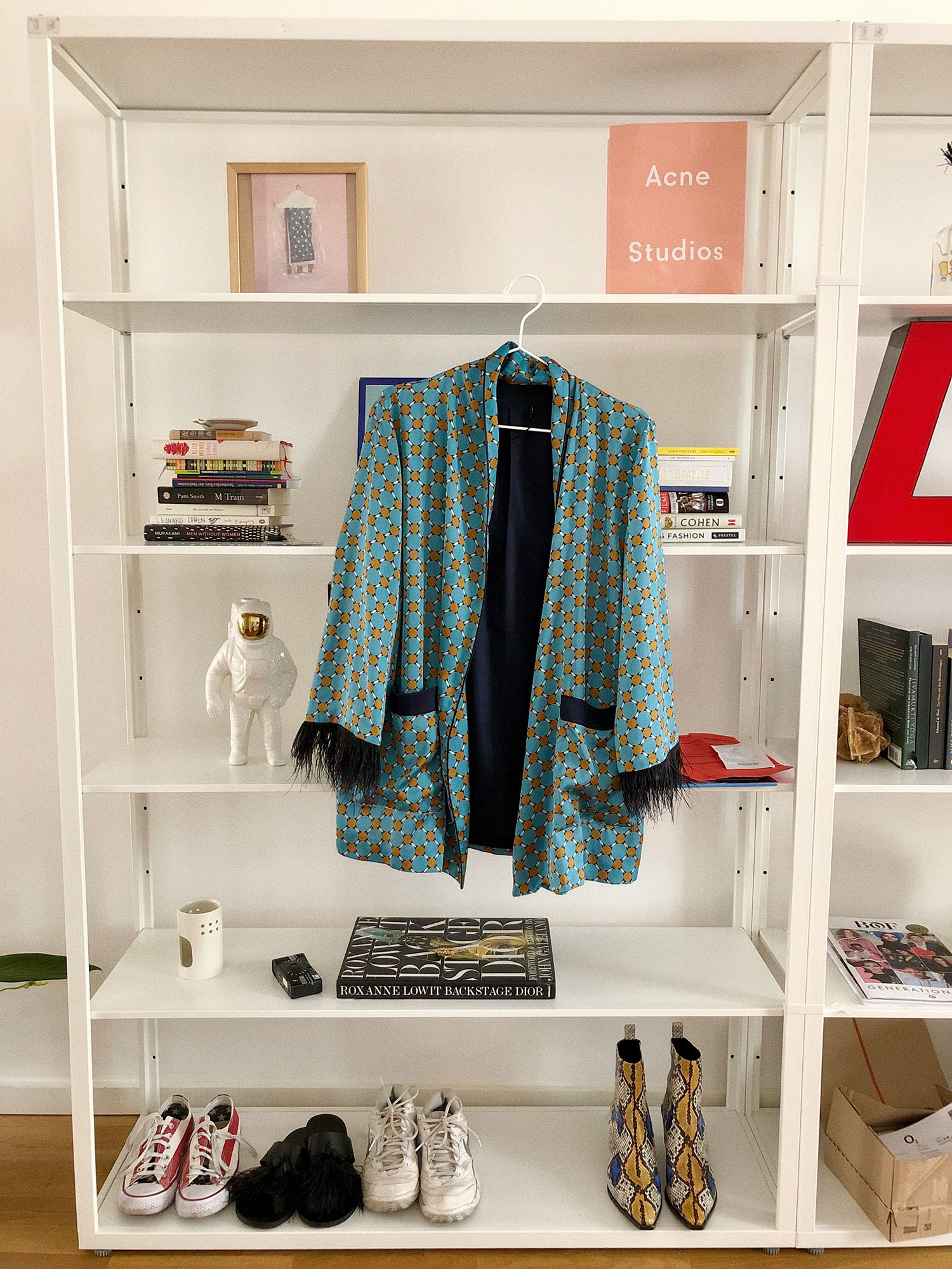 Dann habe ich noch einen Kimono in Türkis mit Federn an den Ärmeln, den ich auch zu einem meiner Lieblingsstücke zähle. Ich mag auffällige Mode, sie macht mir gute Laune und Menschen lächeln einem zu. Vielleicht fahre ich unter anderem auch deswegen Vespa, da bekommt man auch des Öfteren ein Lächeln, was in Berlin ja sonst rar gesät ist.
