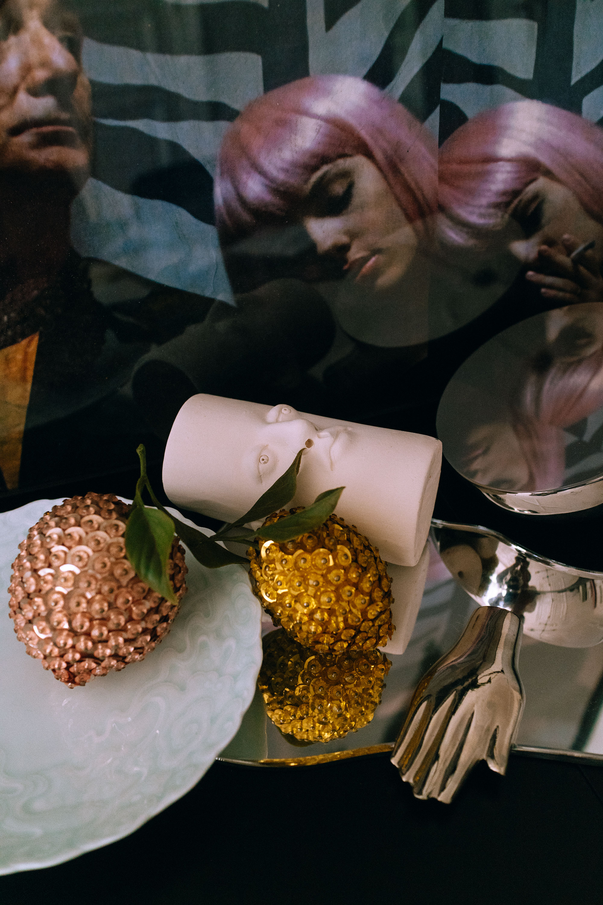 Ich komme recht viel in der Welt herum und habe zusätzlich leider einen Hang zur Sammelleidenschaft. Da ist es wohl nicht verwunderlich, dass meine Interieur-Schätze aus der ganzen Welt kommen. Da wäre einmal ein handverarbeiteter Teller aus Suzhou, China; dann wieder eine skurri-le Tonvase mit einem Gesicht aus Mexico City oder eine eiserne Hand aus Berlin. Meine neusten Entdeckungen waren neben dem Spiegeltablett aus Seoul, Korea auch noch die mit Pailletten besetzten Früchte aus New York − wahre Hingucker, die ein wenig kitschig wirken, aber eigentlich genau meins sind. Die Geschichten hinter diesen Dingen sind eher meine Erlebnisse sowie Erinnerungen an die Momente, in denen ich durch die unterschiedlichsten Länder und Städte wandere, um nur die Dinge mit nach Hause zu nehmen, die mir entweder ins Auge gefallen sind, oder aber Erinnerungen erwecken.