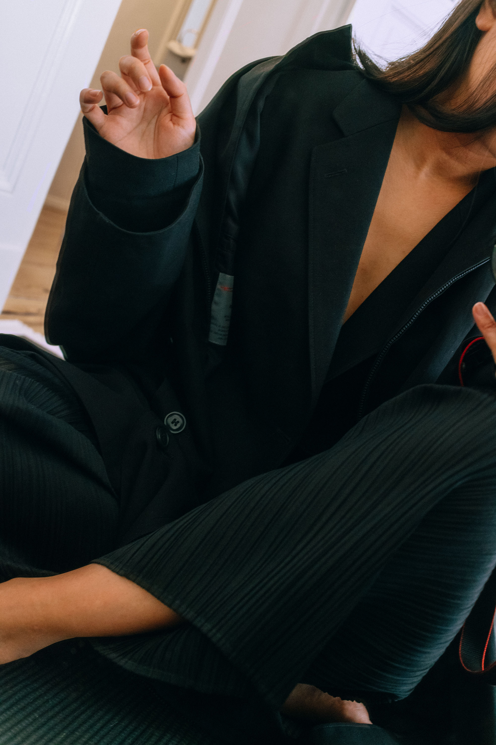 Das letzte Teil fiel mir ebenfalls nicht schwer, denn meine Issey Miyake Pleats Please Hose mit geradem Bein ist seit vielen Jahren ein treuer Begleiter in meinem Alltag. Der Meister des Plissees lässt mich hier niemals im Stich. Da wird aus einer Basic-Hose ein Wardrobe-Staple.