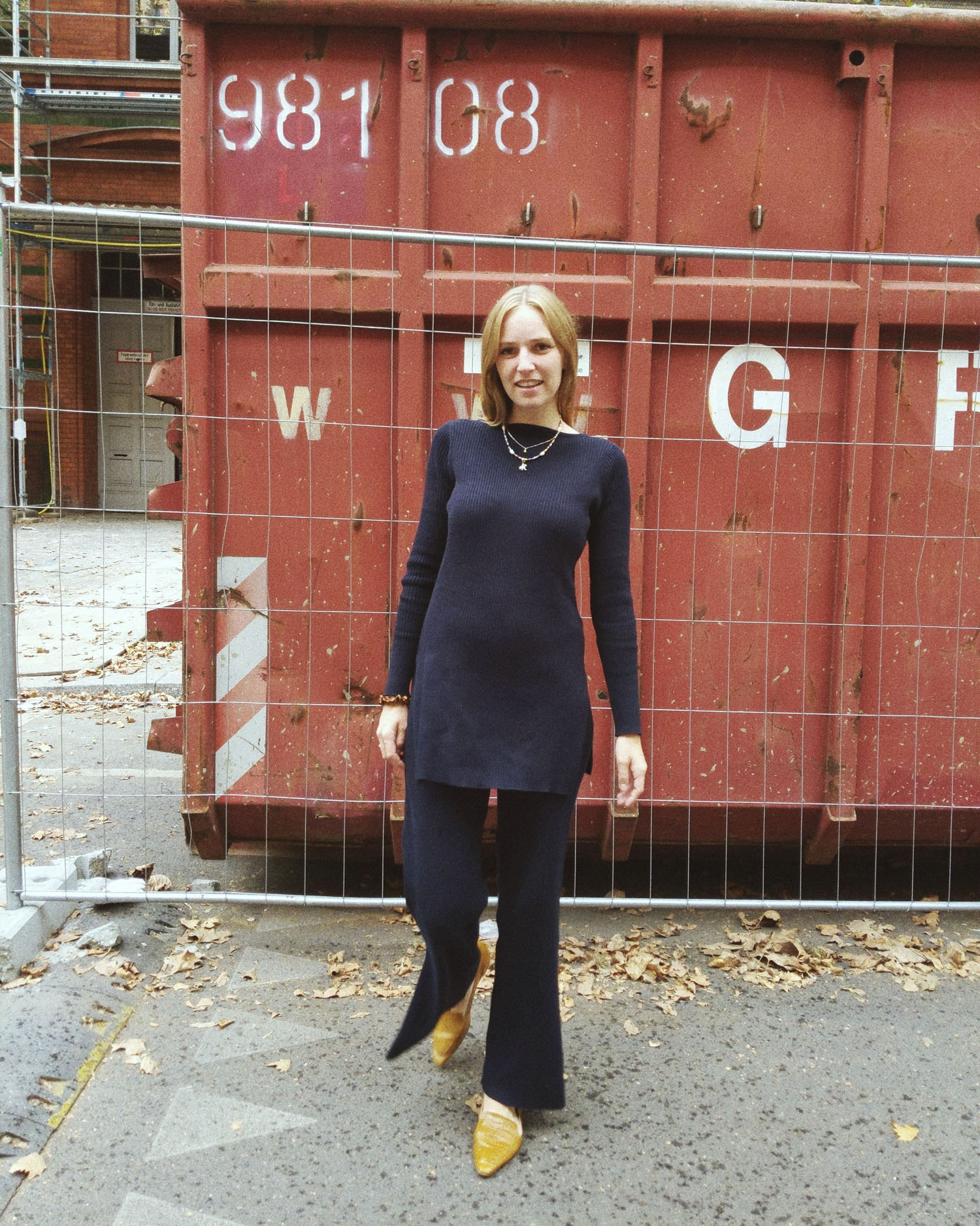 Zweiteiler von Edited (blauer Pulli + passende, geschlitzte Rippstrickhose), Schuhe: Aeyde, Kette: Julia <3, Anhänger: Ciao Amore Studio