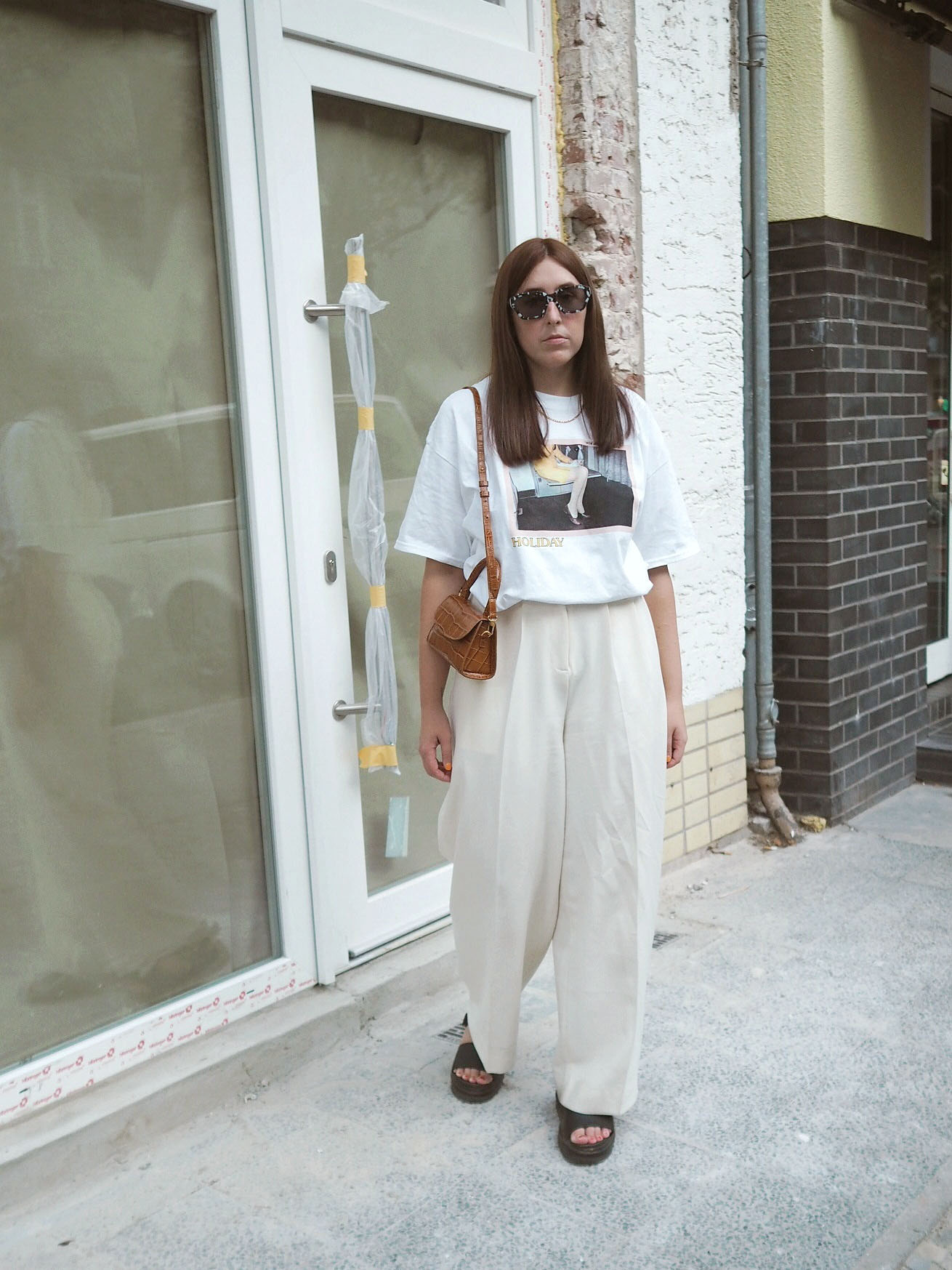 T-Shirt von Holiday the Label (ausverkauft), Hose von Samsøe & Samsøe, Sonnenbrille von Prada, Sandalen von Dr. Martens, Tasche von By Far