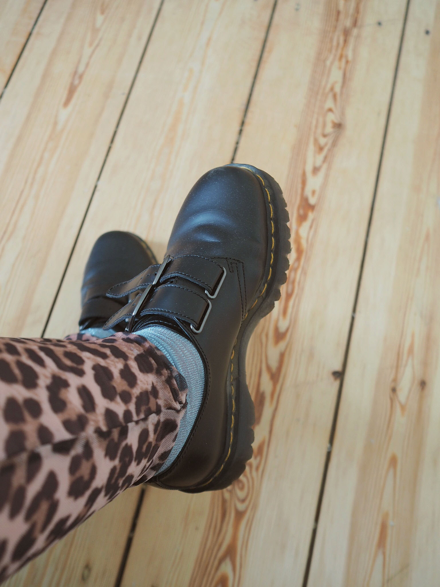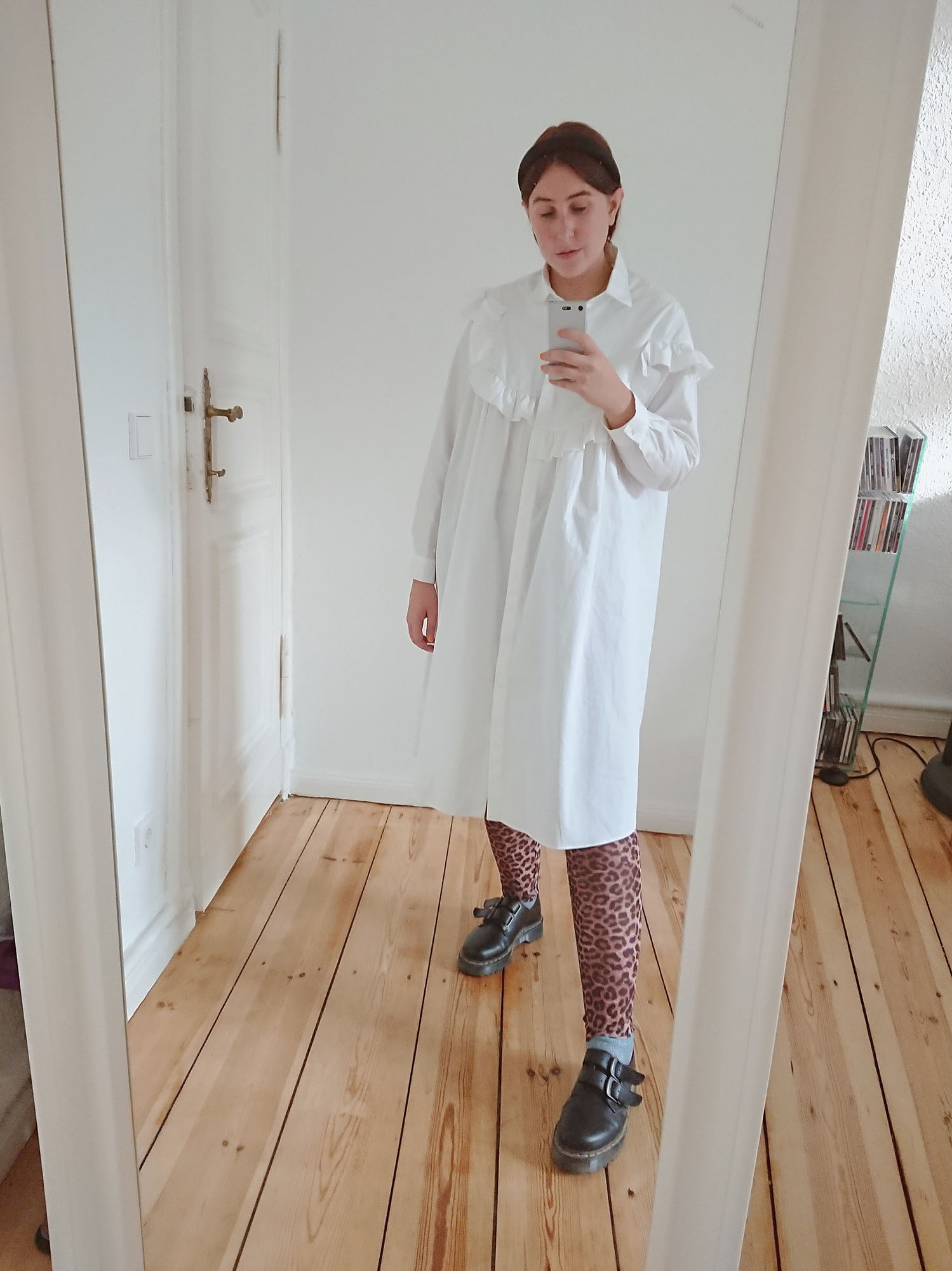 Kleid von Shushu Tong (ausverkauft), Mesh-Leggings von Ganni, Schuhe von Dr. Martens, Socken von Hysteria by Happy Socks (ausverkauft), Haarreif von Henriette von Gruenberg