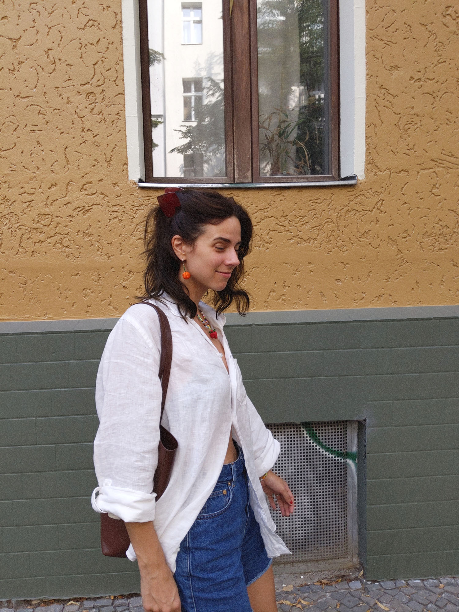 Diese Woche versorge ich euch nur mit Details. Aber wie sagt man so schön: Die Liebe liegt im Detail! Und ich denke das trifft auf mich zu. Ich mache mir gerne Gedanken um kleine Details. Wie ein weißes, schlichtes Baumwoll-T-Shirt mit den richtigen Glitzerohrringen wirken kann. Zap zerap, die auffällige Perlenbeuteltasche dazu kombiniert und aus einem nullachtfünfzehn Outfit wird mein persönlicher Style. So bleibt man in seinem Kleiderschrank auch flexibel, denn ich trage dieselben Sachen hoch und runter, aber mit unterschiedlichen Accessoires. Das Outfit dient als Leinwand für Schmuck, Schuhe und Taschen und kann nach belieben hoch oder runter gestylt werden. Das mag ich!
