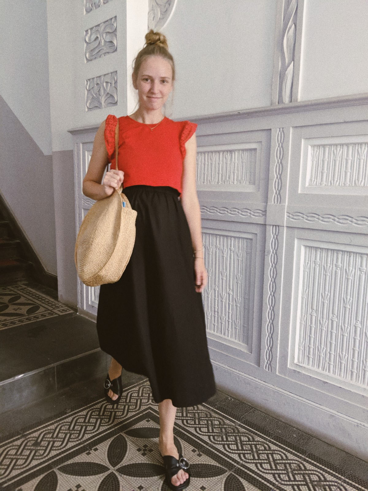 Rock: COS, Shirt: & Other Stories (alt), Schuhe: Edited (alt), Tasche: & Other Stories (alt)