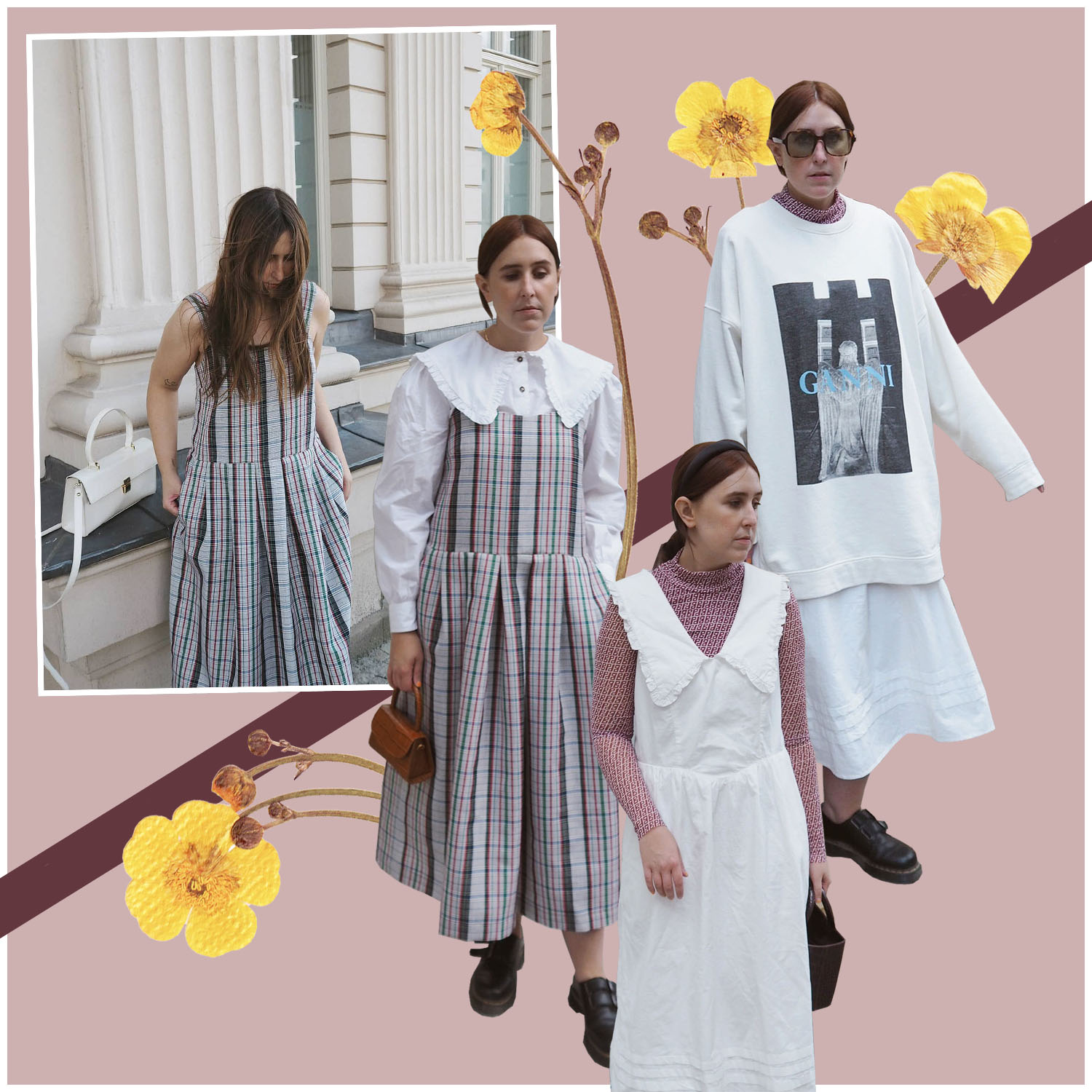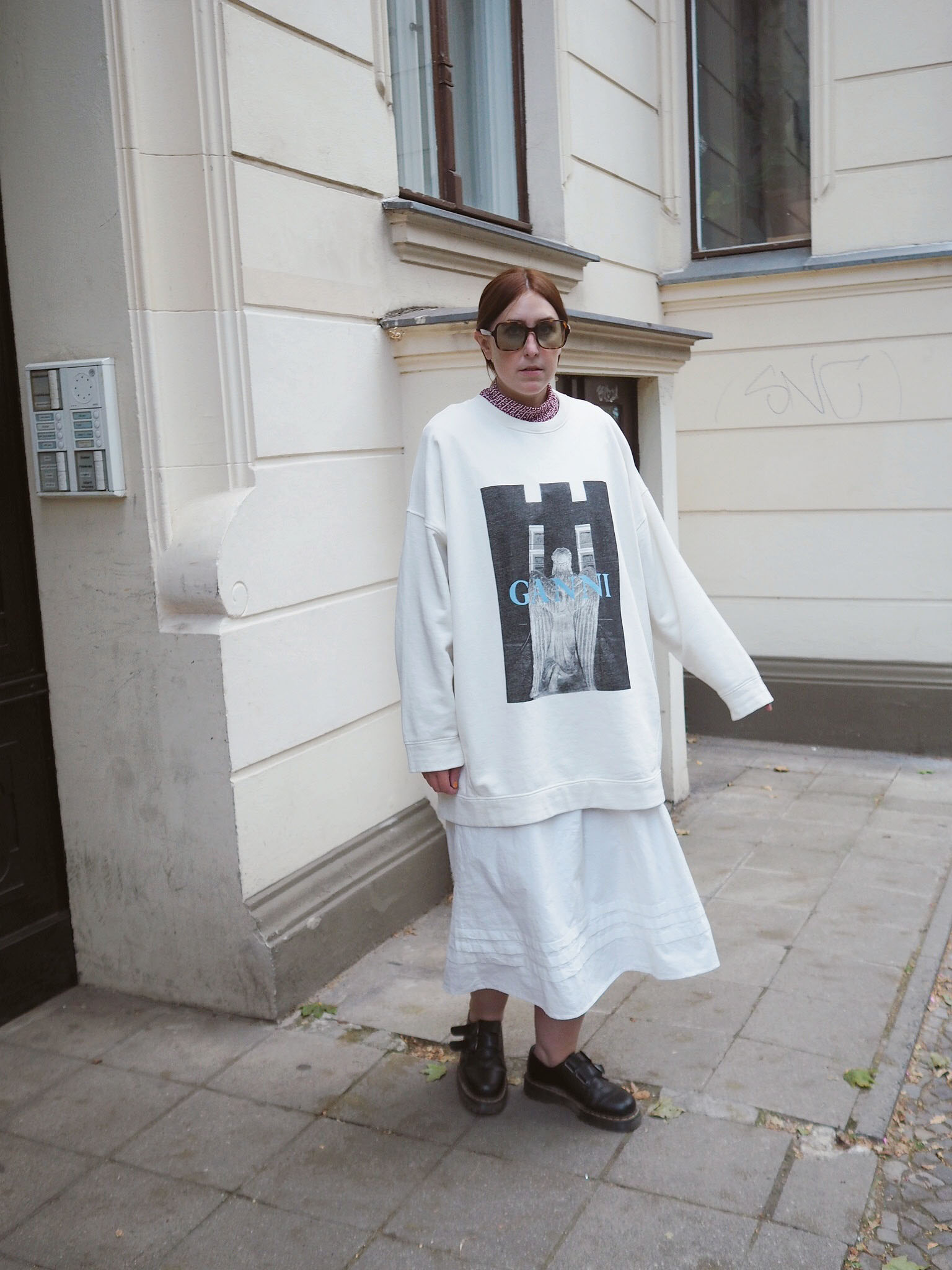 Ich trage ein Baumwollkleid von Urban Outfitters, einen Pullover von Ganni (alt), Schuhe von Dr.Martens und eine Sonnenbrille von AlexaChung (ausverkauft, ähnlich hier)