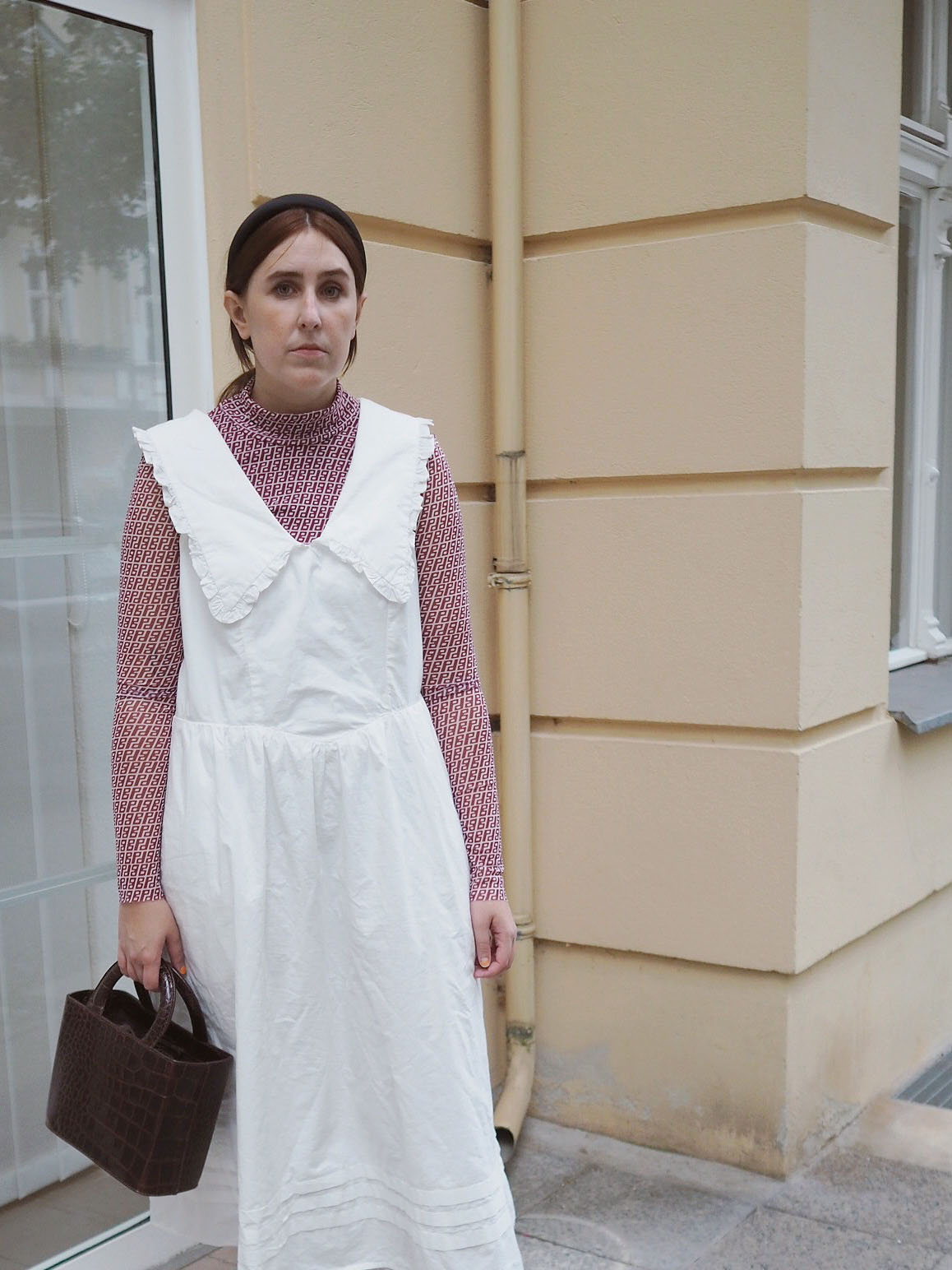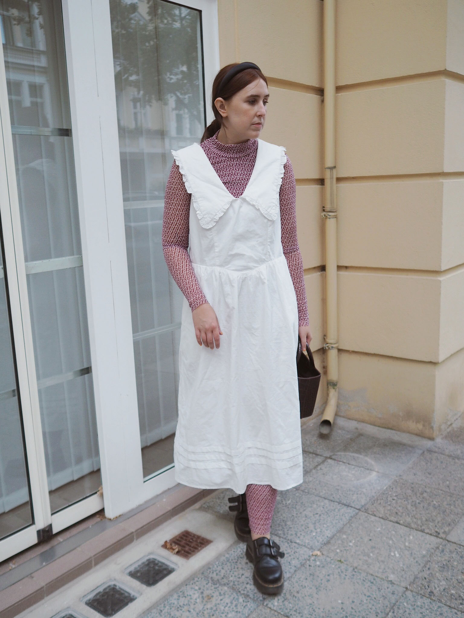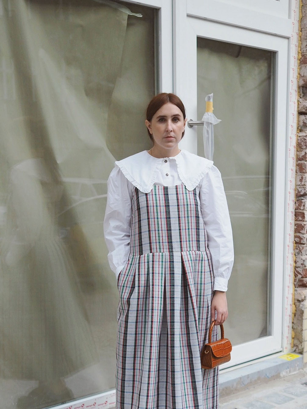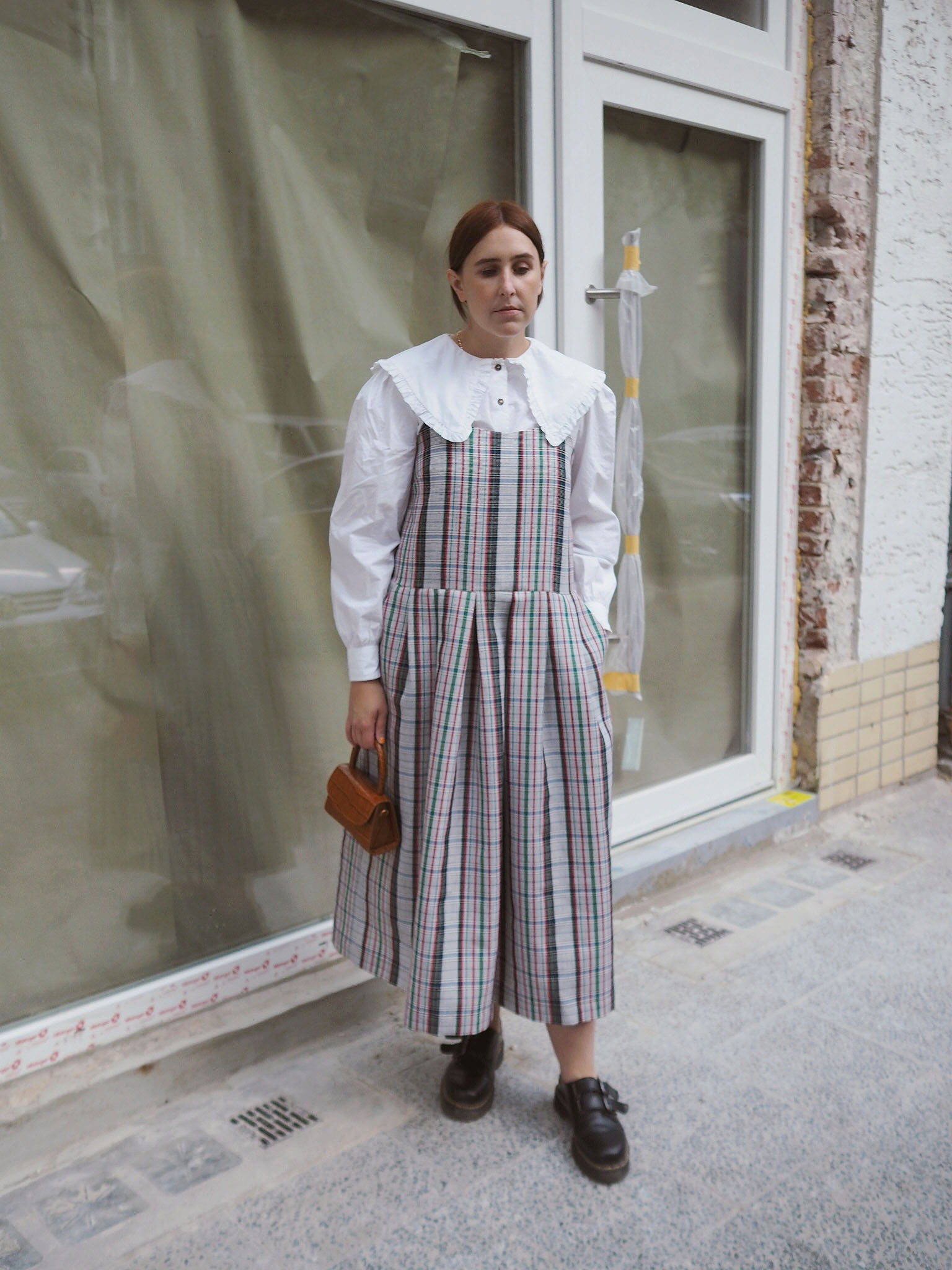 Ich trage eine Bluse von Ganni (ausverkauft), ein Kleid von Shrimps (ausverkauft), eine Tasche von By Far und Schuhe von Dr. Martens