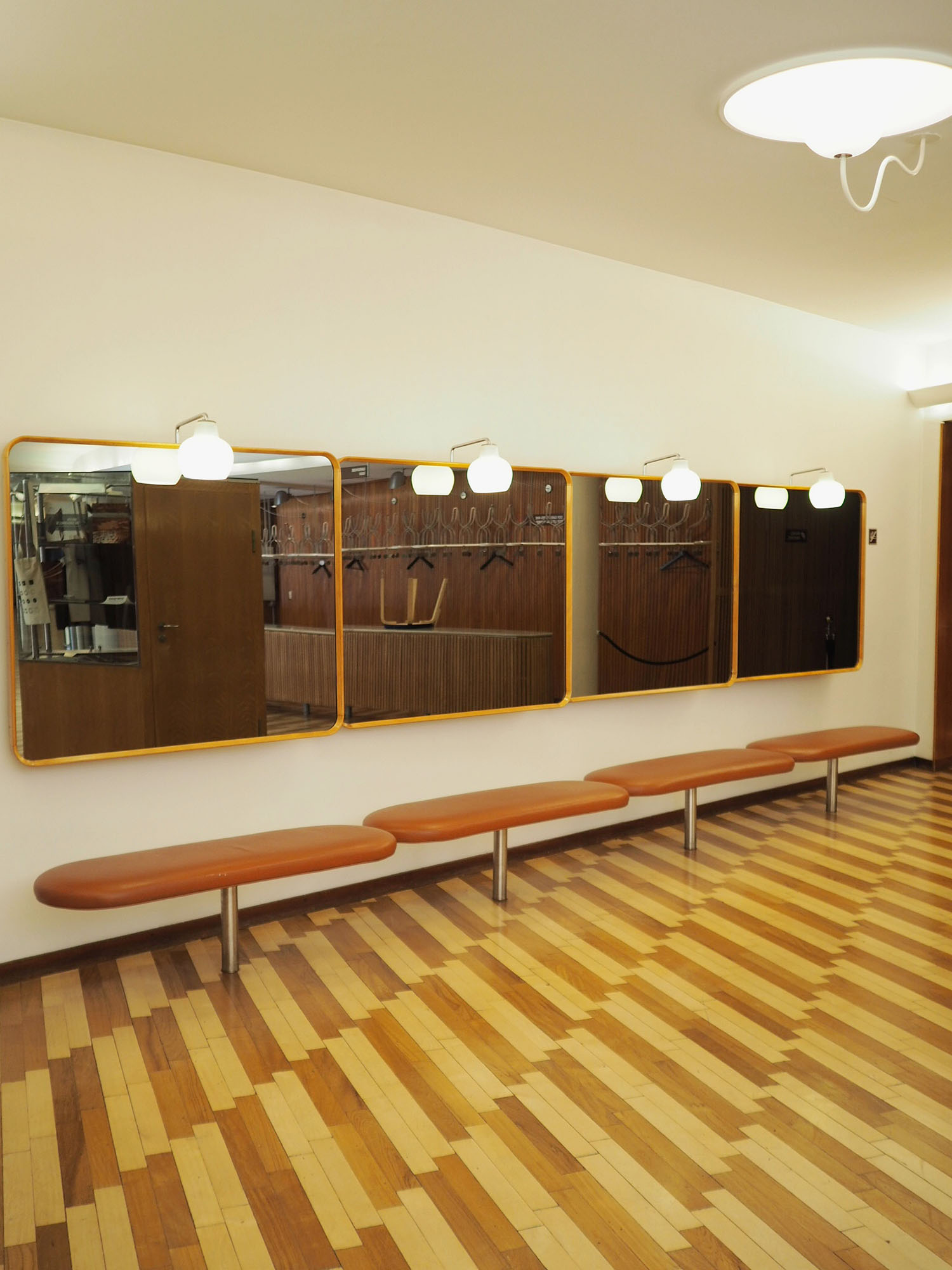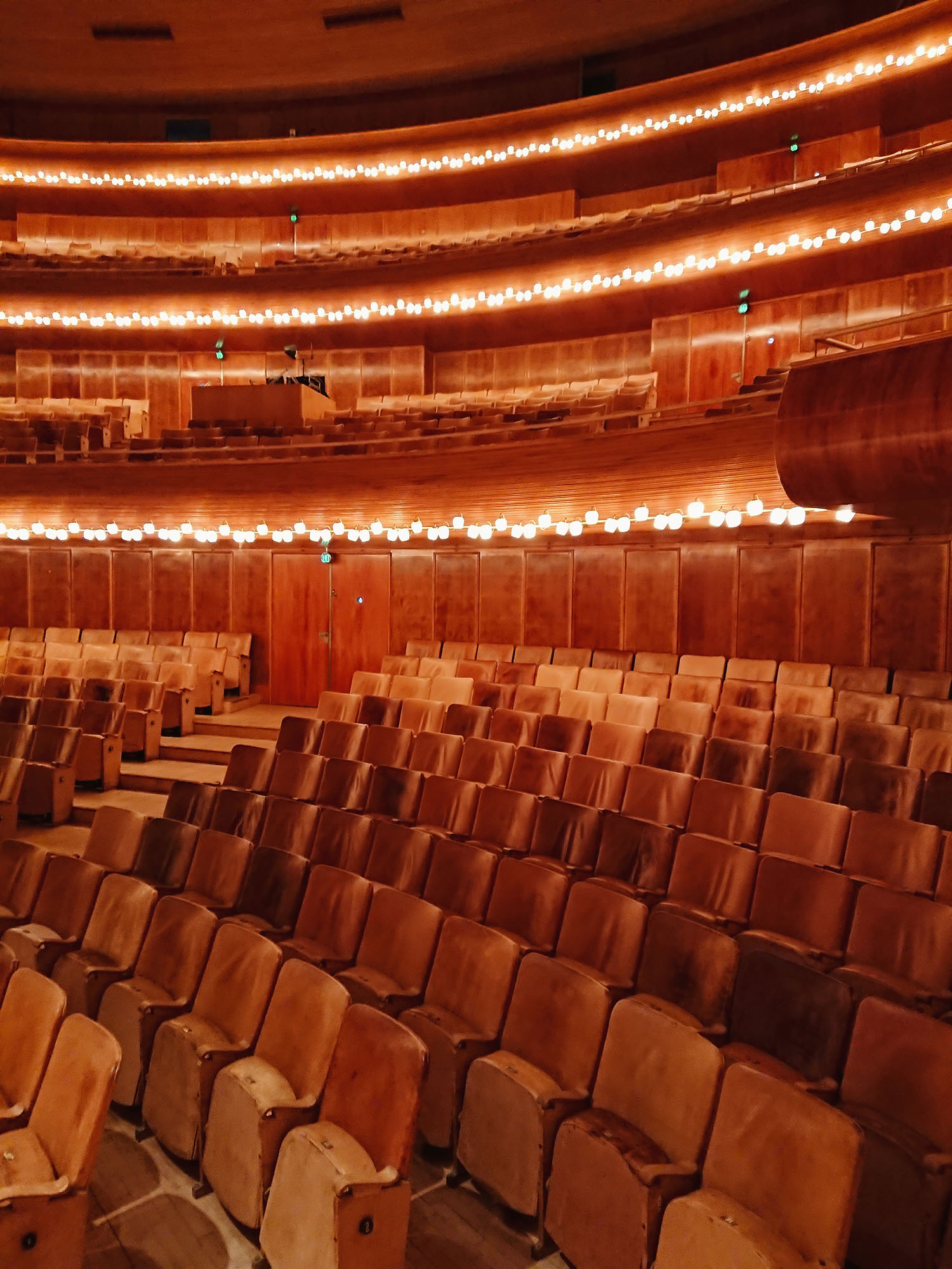 Bereits im August stand ich mit offenem Mund auf dem Balkon des Konzertsaals im Radiohuset und kam aus dem Staunen nicht mehr heraus. Vergangenen Monat präsentierte das Label Saks Potts seine Spring Summer 2020 Kollektion in den festlichen Räumlichkeiten – inklusive Orchester. Heute sind wir, neben einem Organisten, die einzigen Leute, die sich im großen Saal aufhalten und an die mit Lampen bestückte Decke starren. Während das Gebäude, das von Vilhelm Lauritzen designt wurde, früher noch für das Zuhause des dänischen Radiosenders DR war, beherbergt es mittlerweile die Universität Royal Danish Academy of Music. Im Stillen überlege ich, ob meine Blockflöten-Kenntnisse aus der Grundschule reichen, um mich in einen Studiengang einzuschleichen, damit ich zumindest für die nächsten drei Jahre hierbleiben kann. In den Fluren des Gebäudes verknalle ich mich außerdem in sämtliche Einrichtungsgegenstände und plane bereits meinen nächsten Besuch auf einem Trödelmarkt – in der (wohl vergeblichen) Hoffnung, einen ähnlichen Spiegel mit abgerundetem Rahmen oder Sitzbänke ausfindig zu machen.