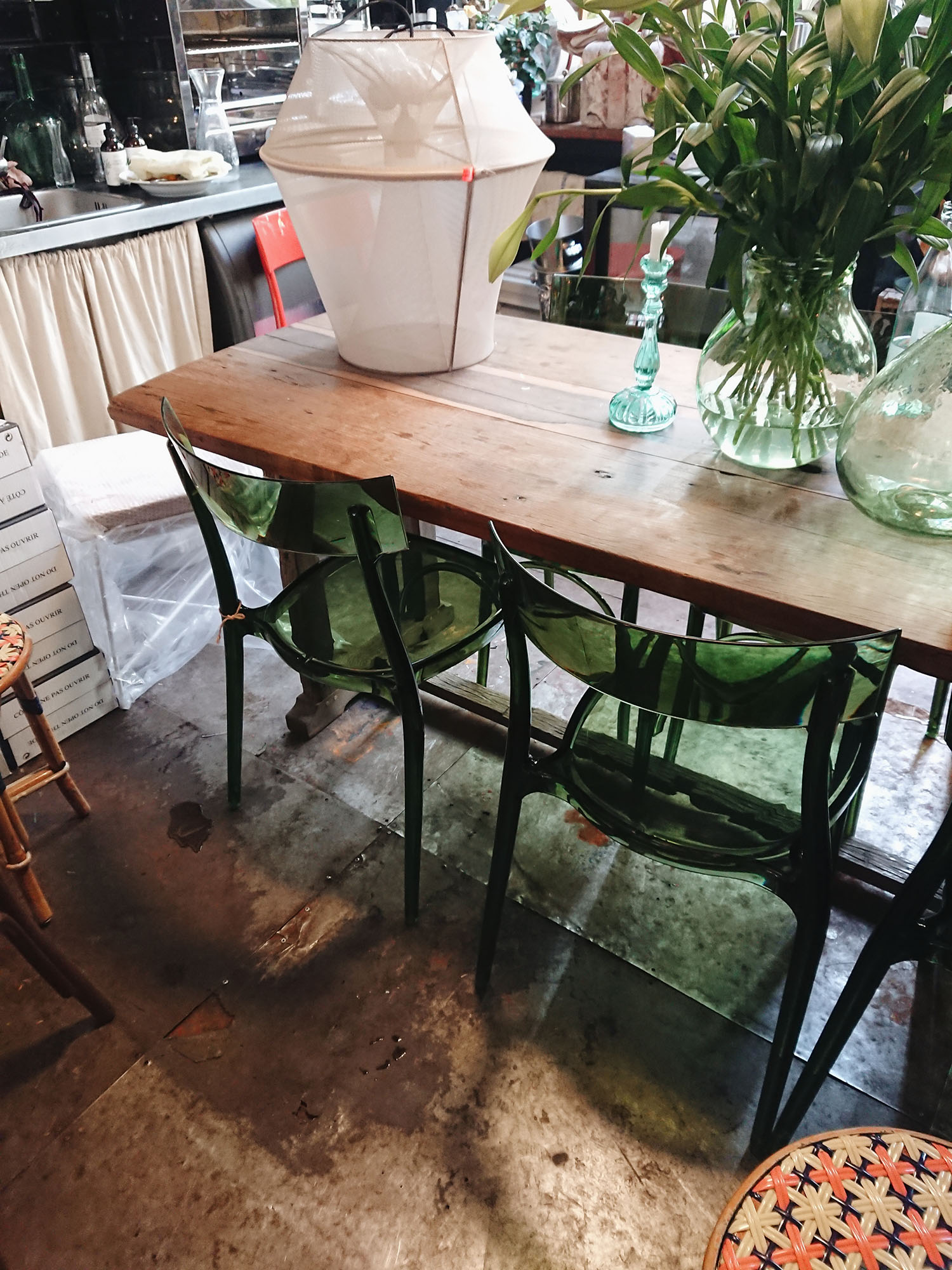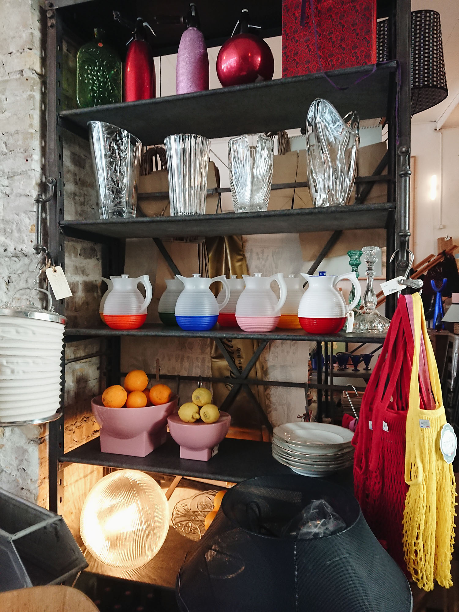 Seit mindestens zwei Jahren lechze ich nun schon nach dem Interior-Geschäft Beau Marché, das eine Mischung aus Vintage und Neuheiten anbietet und ja, ich bin ein bisschen aufgeregt, als ich die Ladentür öffne. Tatsächlich ist es noch viel schöner, als ich gedacht hätte, und ein wenig fühle ich mich sogar wie im Einrichtungshimmel. Gedanklich verschiffe ich bereits die grünen Stühle, die pinken Obstschalen und all die Tische, von denen ich nicht genug bekommen kann, in meine Wohnung. Weitere Highlights sind die zahlreichen Gläser, Tassen und Krüge sowie die großen Plakate mit hübschen Illustrationen. Wer sich gar nicht von Beau Marché trennen mag, der kann sich vor dem Geschäft auch noch einen Kaffee (oder wahlweise einen Aperol Spritz) schmecken lassen.