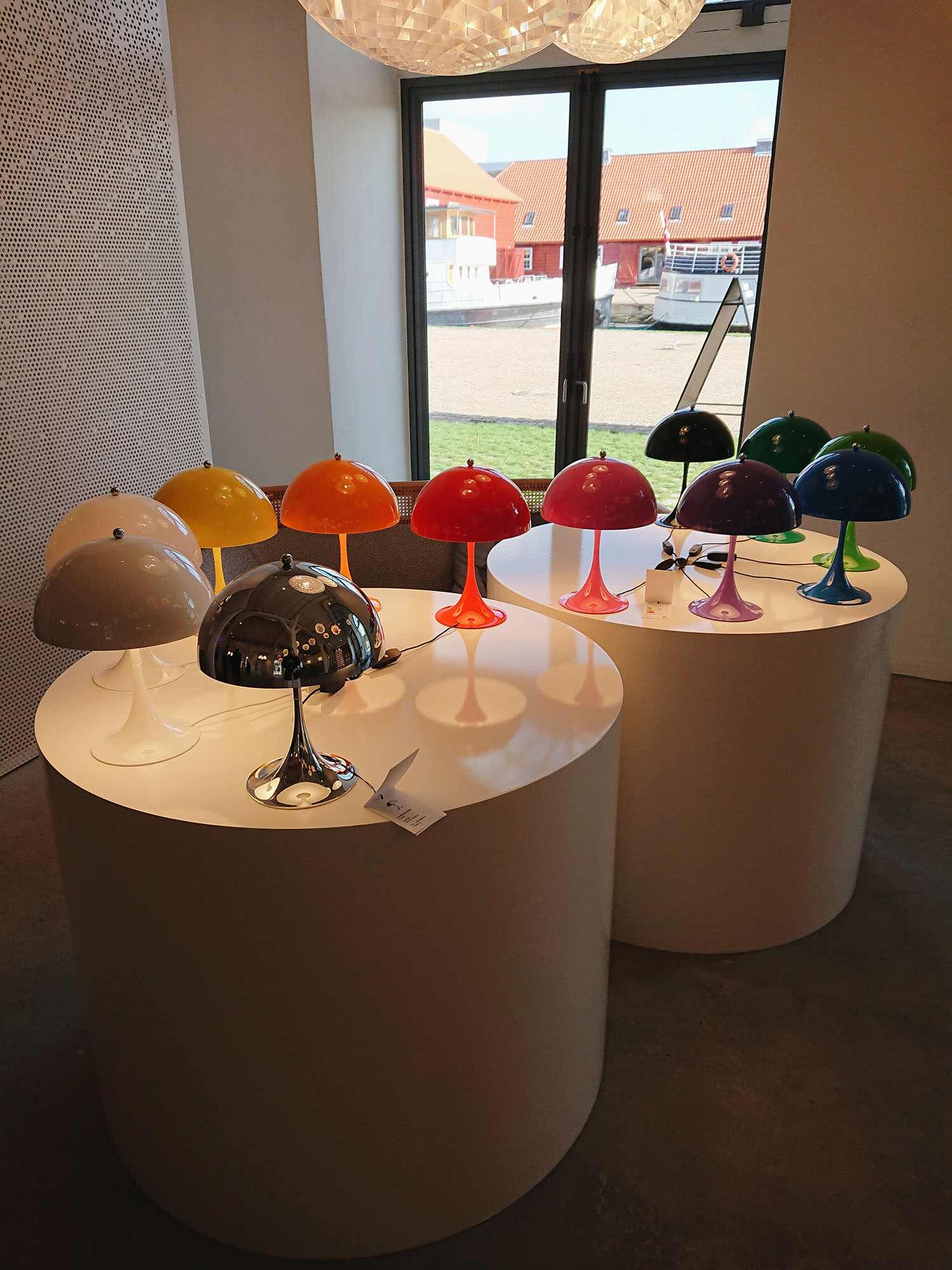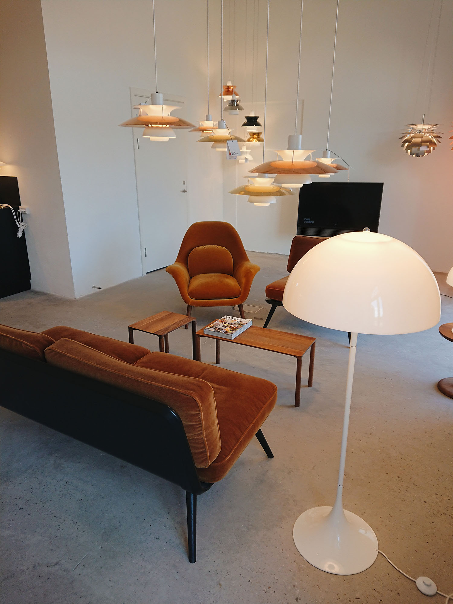 Von dort aus laufen wir gemeinsam über eine Brücke (die zwischendurch in zwei geteilt wird, damit ein großes Schiff passieren kann, was ich fasziniert beobachte, während auf der anderen Seite ungefähr 83 Fahrradfahrer warten), vorbei an hübschen Büroräumen und kommen schließlich im noch schöneren Showroom von Louis Poulsen an. Ich stelle fest, dass ich mindestens zehn PH 5 Lampen in verschiedenen Größen für meine eigene Wohnung brauche und ganz vielleicht auch irgendwie noch die schöne braune Sofagarnitur klauen muss. Wir bekommen reichlich Informationen, etwa, dass die Stehlampe „The Water Pump“ ganze 50 Jahre lang nicht in Produktion war, ganz bald aber als limitierte Edition für drei Monate auf den Markt kommt. Es gibt Kaffee aus einer Hightechmaschine und leckeren Tee, für den ich heute besonders dankbar bin.