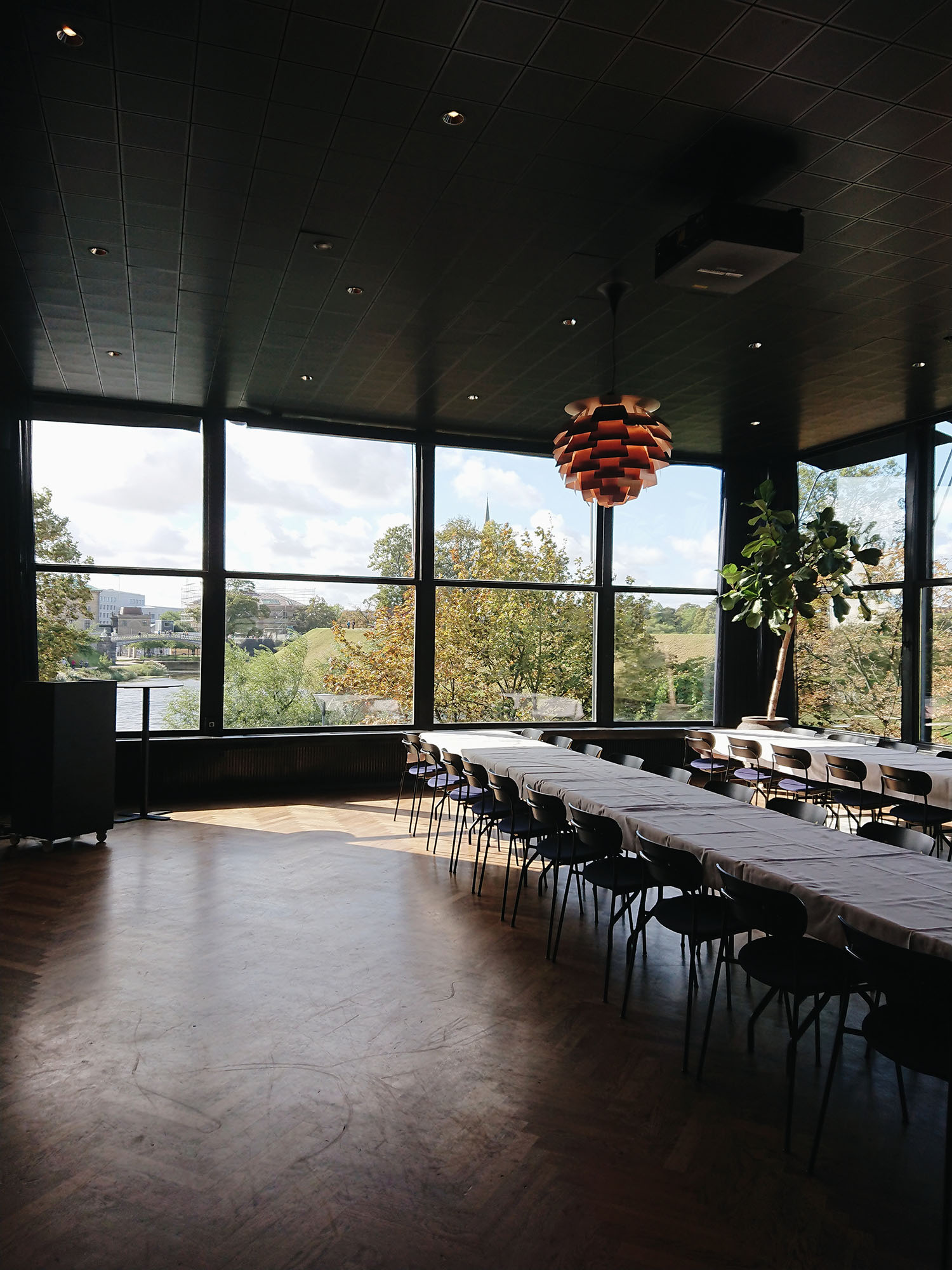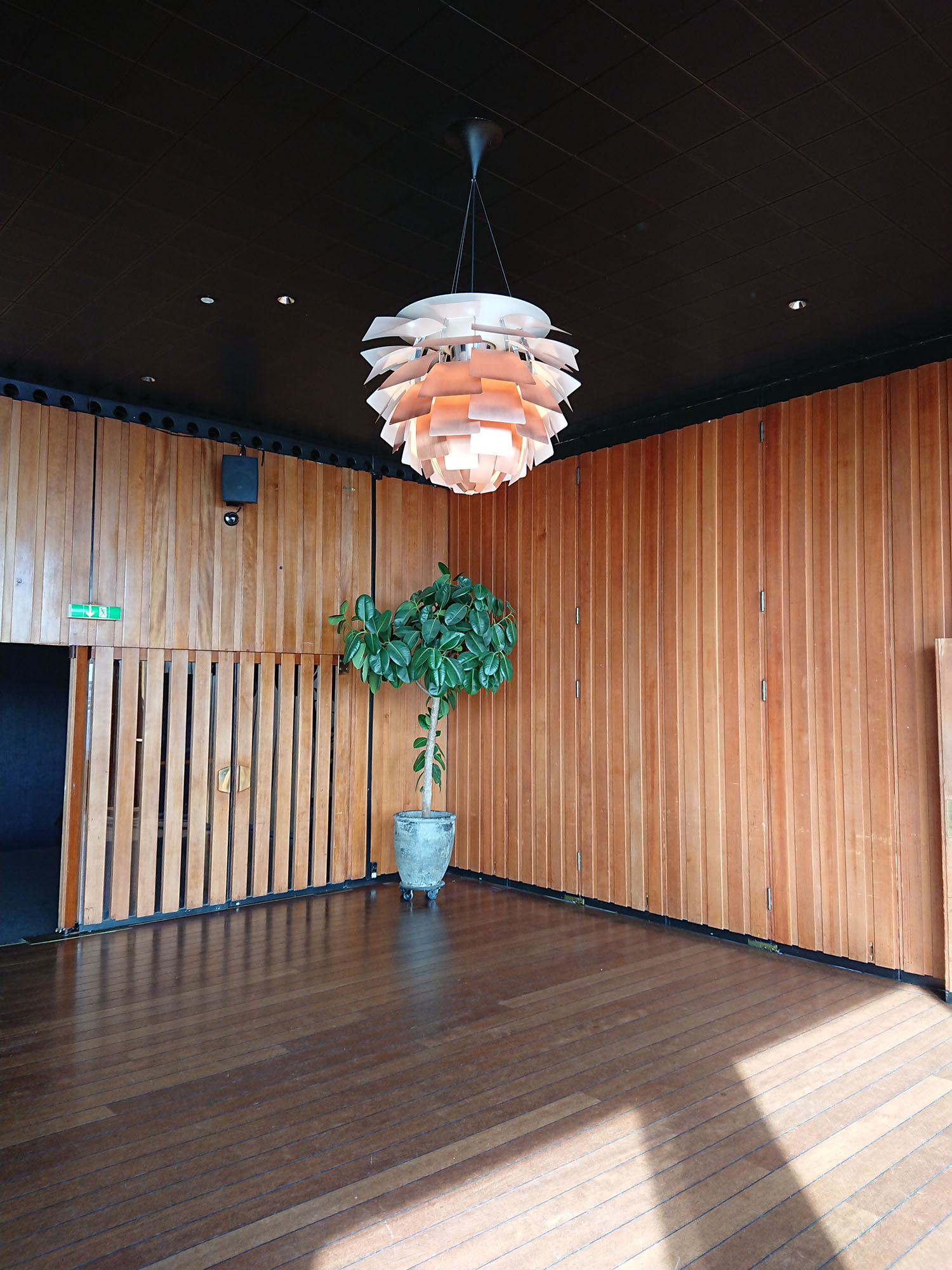 Zugegeben, der Veranstaltungsort Langelinie Pavillonen erinnert mich von außen an die Rheingoldhalle in Mainz, hat in Sachen Innenarchitektur aber einiges mehr zu bieten. Schon der Anblick der Eingangshalle führt dazu, dass wir wie die Blöden fotografieren und kaum ein Schrittchen vorankommen. Aber Mensch, die oberen Räume sind fast noch ein bisschen schöner, mit den riesigen Fenstern, den Holzwänden und -decken und einer Terrasse, von der man sogar einen Blick auf die Bronzefigur der kleinen Meerjungfrau werfen kann (und zwar ohne, sich an der permanenten Menschentraube vorbeiquetschen zu müssen). Früher war Langelinie Pavillonen ein Restaurant, das mit jeder Menge Louis Poulsen Leuchten geschmückt war. Mit der Zeit wurde der Großteil geklaut und nur teilweise ersetzt – ein echtes Exemplar der ursprünglichen Artischocke hängt allerdings noch immer im Gebäude.