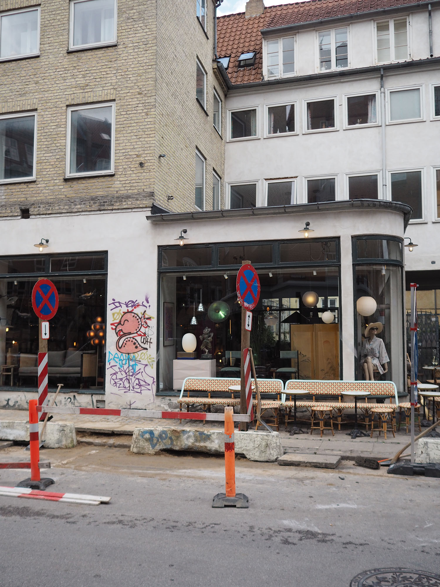 Unser kurzer Weg für den ersten Kaffee-Stopp führt uns auf die andere Straßenseite, wo wir zunächst die hübsche Einrichtung des Cafés Depanneur bewundern, bevor wir uns tatsächlich etwas bestellen. Für mich reicht es dank Mecker-Magen heute nur für einen Tee, was aber nicht weiter schlimm ist, denn so bleibt mir zumindest genügend Zeit, das Ambiente aufzusaugen. Depanneur beschreibt sogenannte Convenience Stores im kanadischen Quebec und weiteren französisch-sprachigen Ecken Kanadas. Hier gibt es von Kaffee über Bier und Wein bis hin zu Snacks und Dosentomaten, alles, was man „mal eben so braucht“. Und tatsächlich befindet sich an der Wand ein Regal mit flachen Büchsen, die stark nach eingelegtem Fisch aussehen. In einem Kühlregal stehen jede Menge unterschiedliche Getränke, deren Etiketten alleine mich ein wenig an ein Filmsetting erinnern und ich verspreche mir schon jetzt, beim nächsten Kopenhagenbesuch auch den zweiten Depanneur-Laden aufzusuchen.