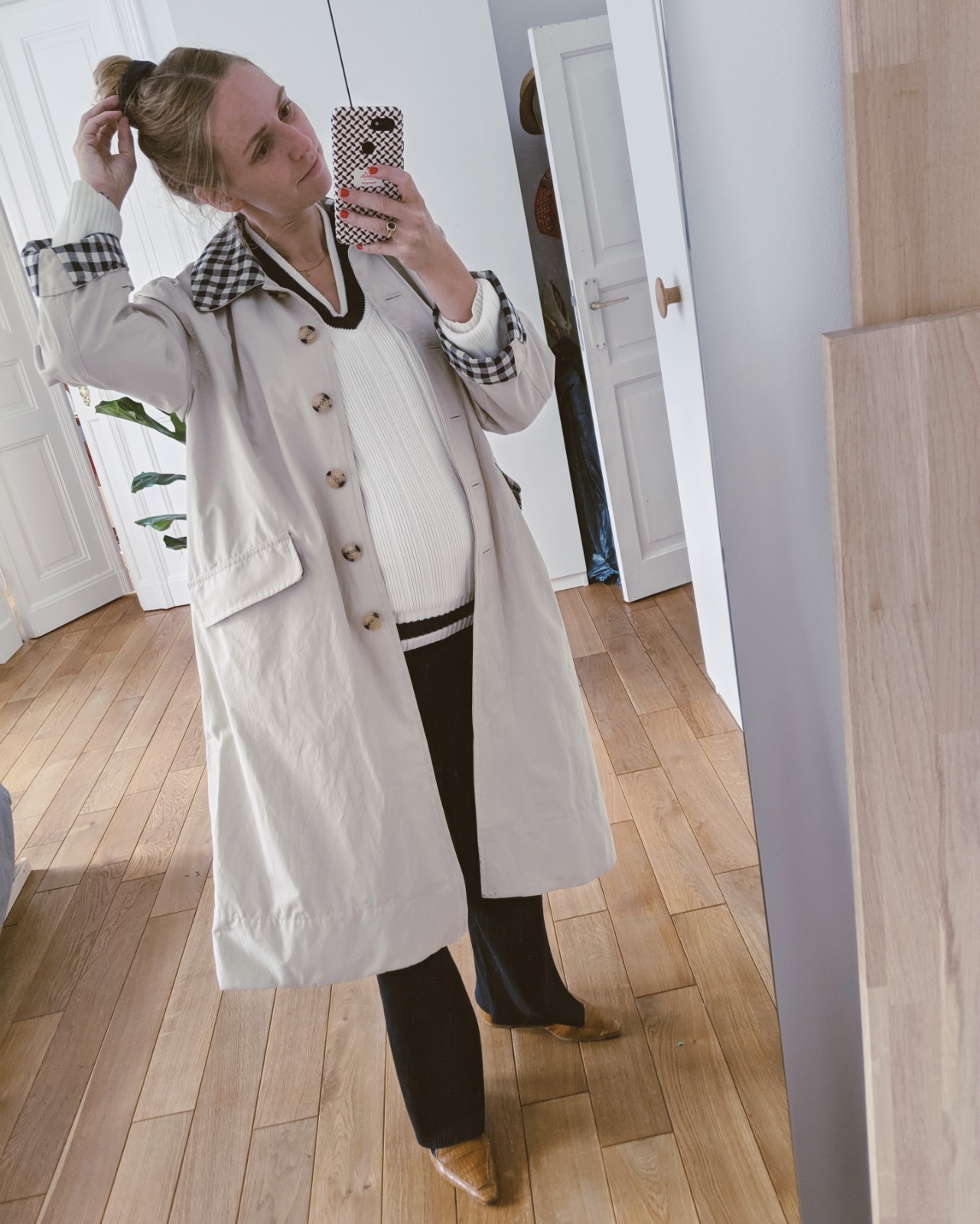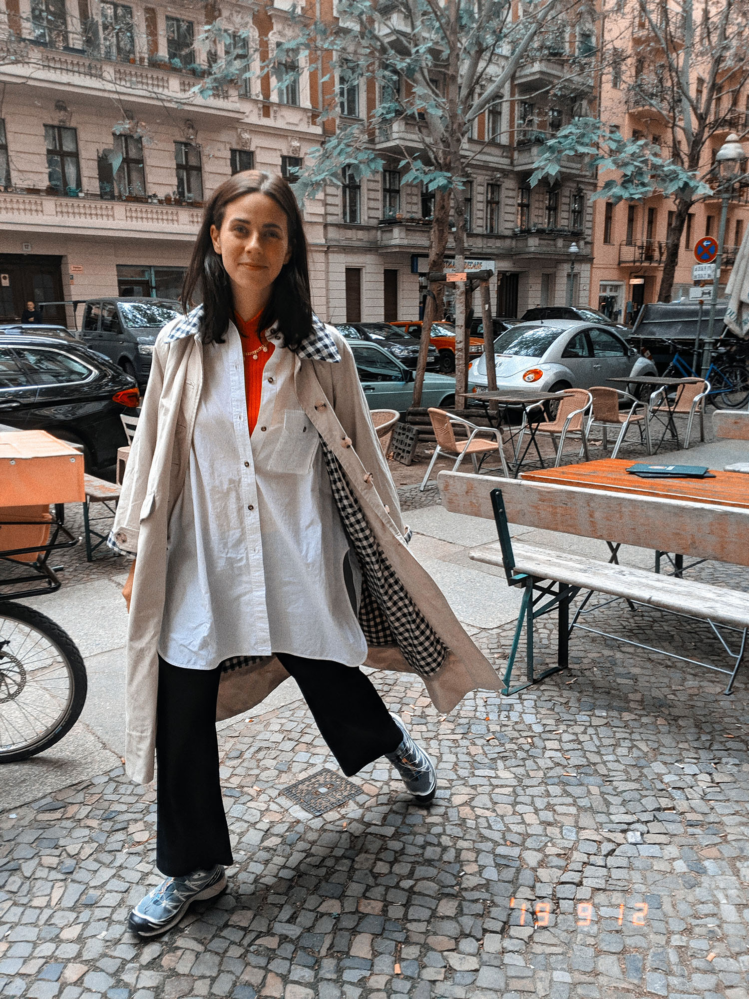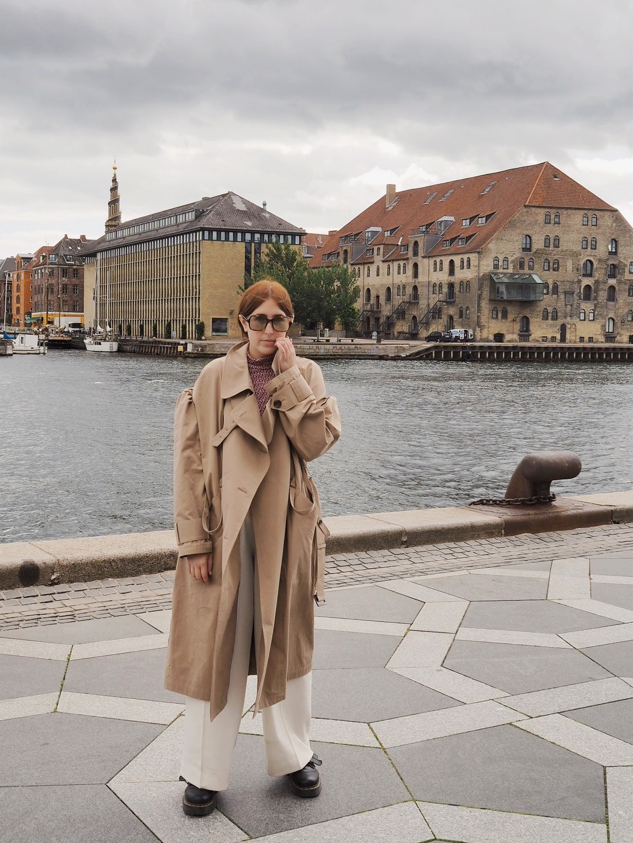 Trenchcoat von Pushbutton (alt), Hose von Samsøe & Samsøe, Mesh-Rollkragen von Baum und Pferdgarten (ausverkauft), Schuhe von Dr. Martens (ausverkauft)