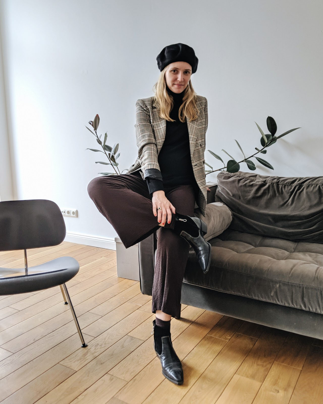 Blazer: & Other Stories (alt / ähnliche hier), Rollkragen: Arket, Hose: Edited the Label, Schuhe: Aeyde, Beret: lala Berlin