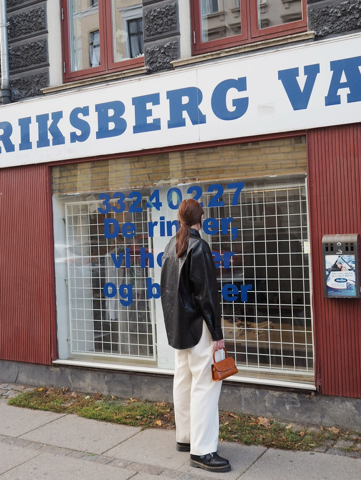 Hemd aus veganem Leder von Pixiemarket, Hose von Samsøe & Samsøe, Schuhe von Dr. Martens (ausverkauft), Tasche von By Far