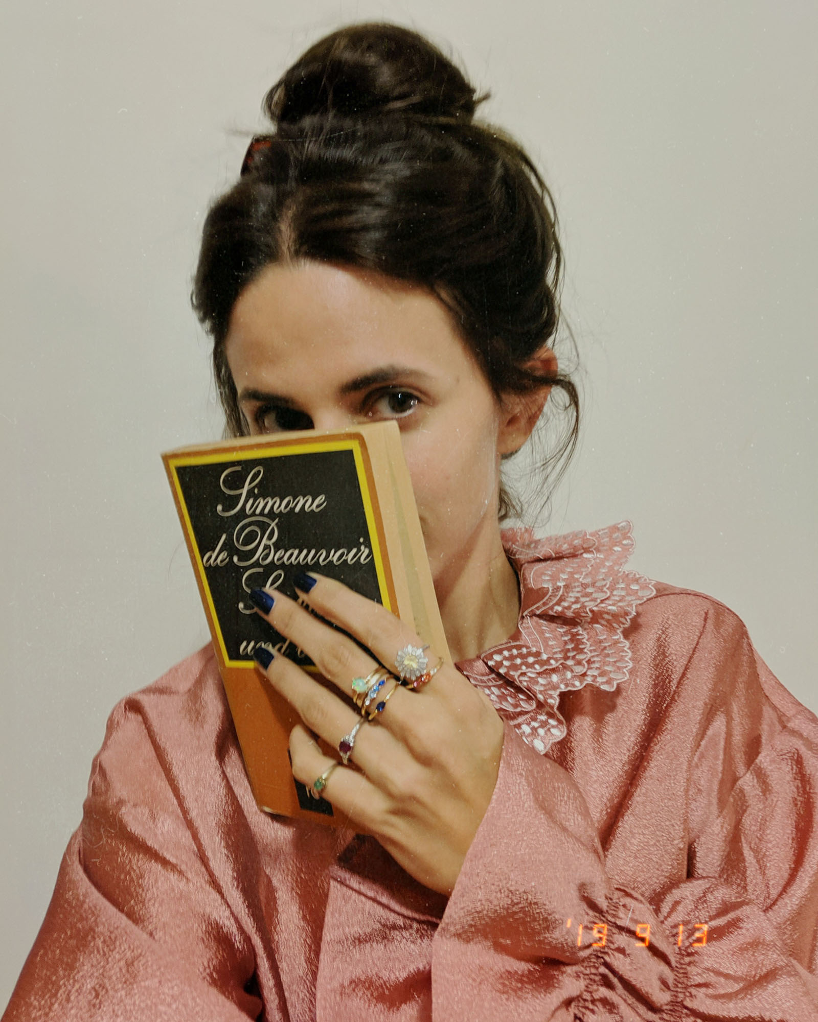 Bluse: Stine Goya, Ringe: Local Eclectic, Buch: „Sie kam und blieb“