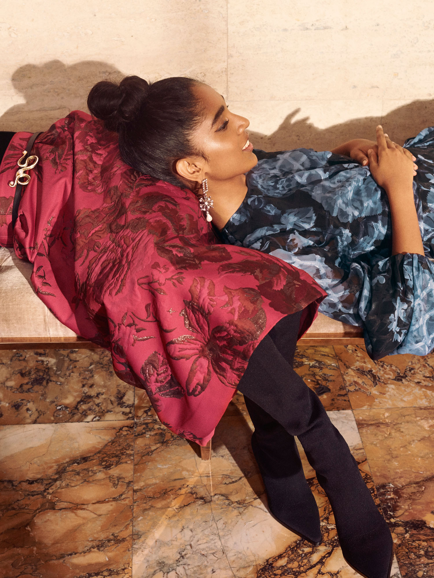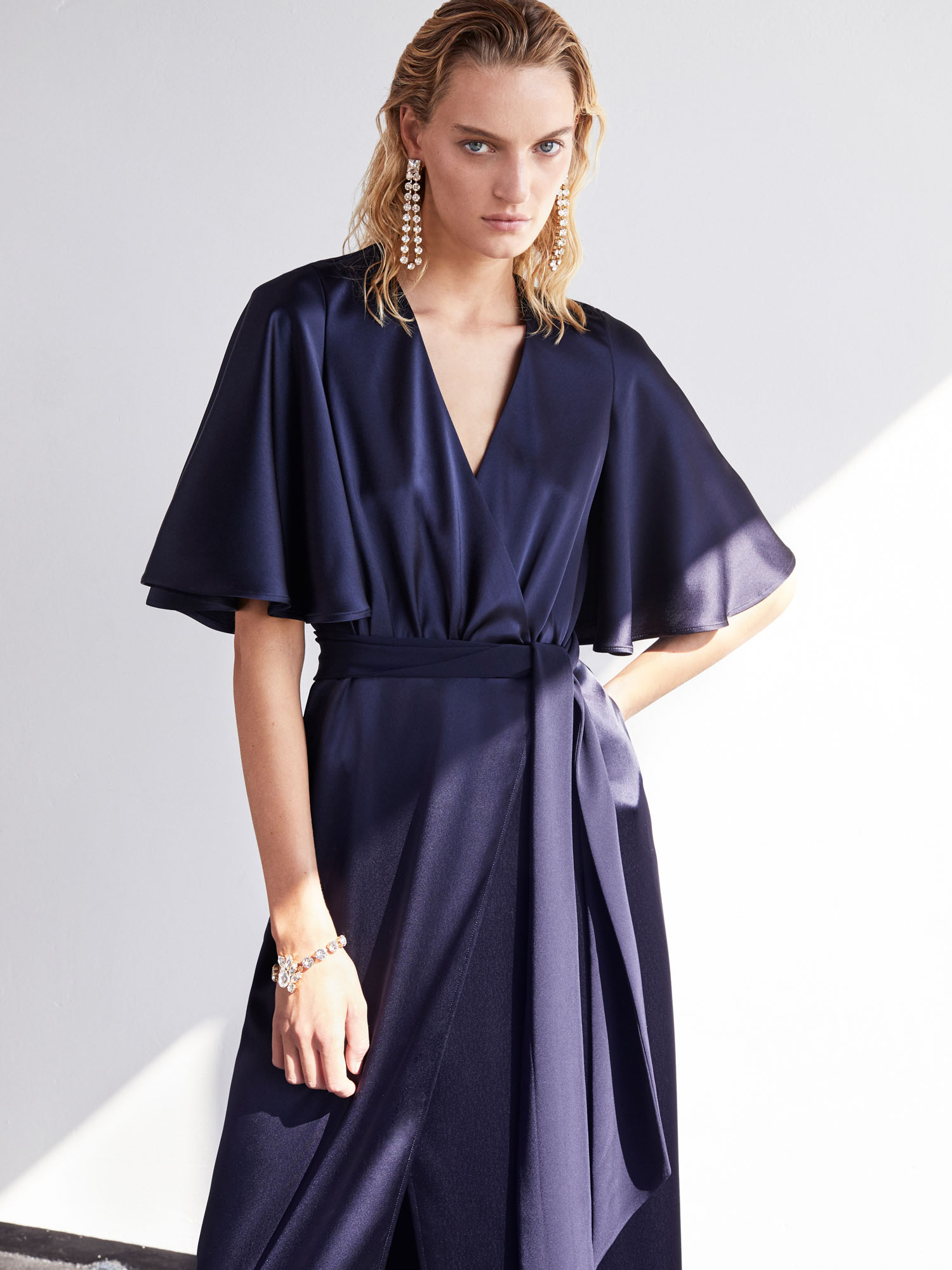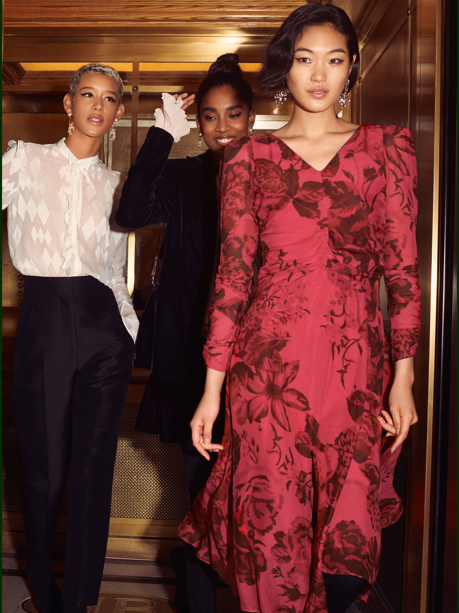 Romantische Kleider spielen eine Hauptrolle in der zweiten Conscious Exclusive Kollektion dieses Jahres: das kobaltblaue Abendkleid mit Jacquard in Rosenmuster und die bodenlange altrosa Tüll-Robe gehören zu den Key Pieces. Dazu gesellt sich das Minikleid im Harlequin-Muster aus Pailletten – allesamt gefertigt mit recyceltem Polyester. Auch der Hosenanzug aus Samt wurde aus recyceltem Polyester gefertigt und zusätzlich mit einem bestickten Gürtel verziert. Dazu gibt es Strickpullover aus Materialgemisch mit TENCEL™ Lyocell Fasern und Wolle, das teilweise mit recycelten Glasperlen bestickte Cape, das gerüschte Samt-Oberteil aus recyceltem Polyester und die Auswahl an bezaubernden Haarspangen, für die recyceltes Zink und Messing eingesetzt wurden.