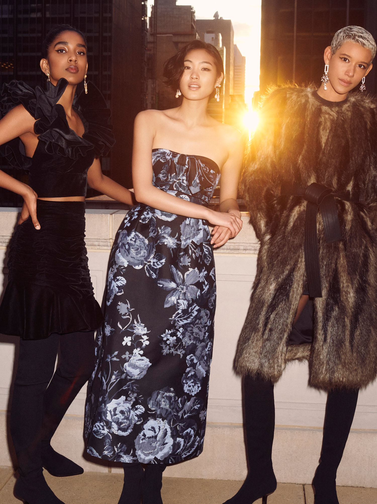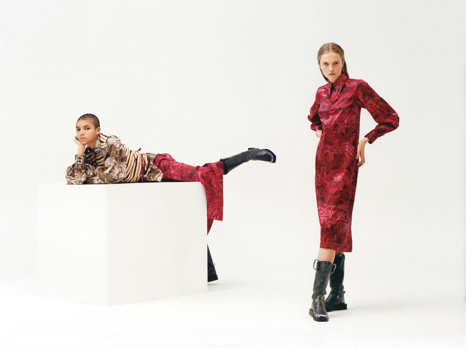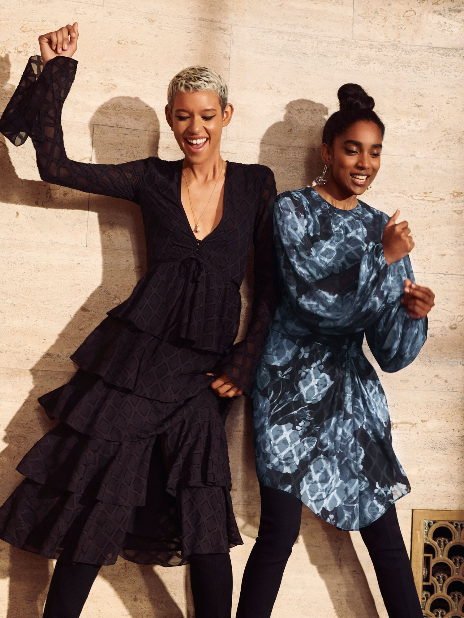 Romantische Kleider spielen eine Hauptrolle in der zweiten Conscious Exclusive Kollektion dieses Jahres: das kobaltblaue Abendkleid mit Jacquard in Rosenmuster und die bodenlange altrosa Tüll-Robe gehören zu den Key Pieces. Dazu gesellt sich das Minikleid im Harlequin-Muster aus Pailletten – allesamt gefertigt mit recyceltem Polyester. Auch der Hosenanzug aus Samt wurde aus recyceltem Polyester gefertigt und zusätzlich mit einem bestickten Gürtel verziert. Dazu gibt es Strickpullover aus Materialgemisch mit TENCEL™ Lyocell Fasern und Wolle, das teilweise mit recycelten Glasperlen bestickte Cape, das gerüschte Samt-Oberteil aus recyceltem Polyester und die Auswahl an bezaubernden Haarspangen, für die recyceltes Zink und Messing eingesetzt wurden.