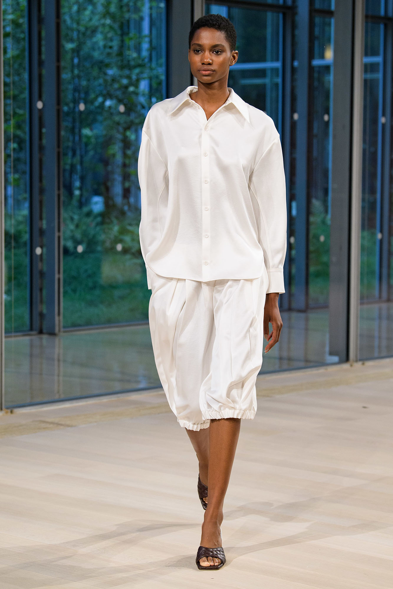 Die Entwürfe von Mary-Kate und Ashley Olsen zeigen sich in gewohnt minimalistischer Tragbarkeit, weite Silhouetten und ruhige Farben stehen im Vordergrund. Noch mehr Ruhe erhalten die Looks durch ihr monochromes Styling, das The Row perfektioniert zu haben scheint. Beige, Schwarz und Weiß von Kopf bis Fuß verleihen den Kreationen eine nonchalante Coolness, gleichzeitig jedoch auch eine Stärke, wie man sie etwa von Phoebe Philos Kollektionen kennt. Weite Blazer werden zu übergroßen Hosen gestylt, Hemden fallen locker nach unten, statt die Taille zu betonen.