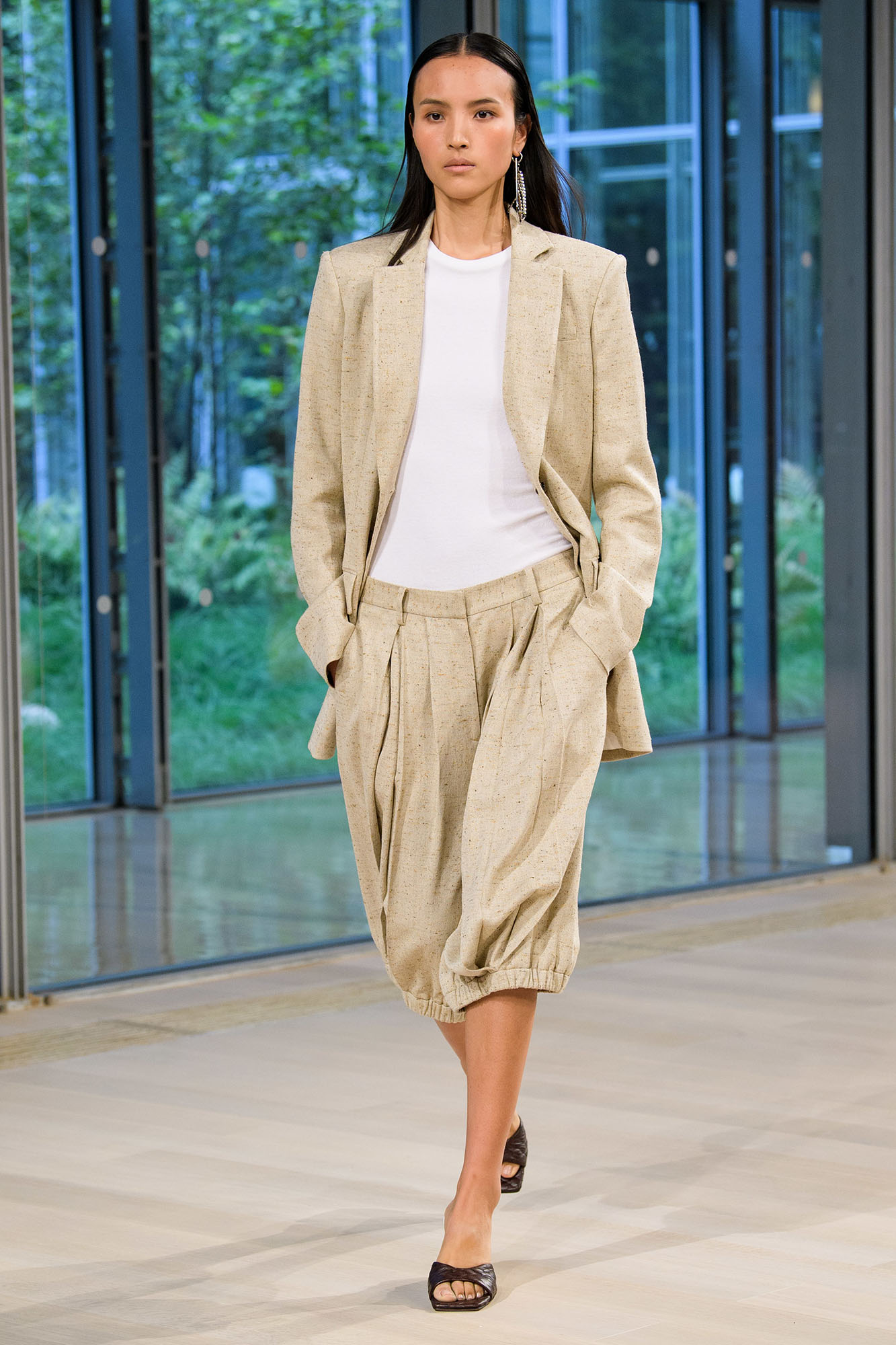 Monochrome Looks in Sandfarben & weite Silhouetten, die miteinander kombiniert werden.
