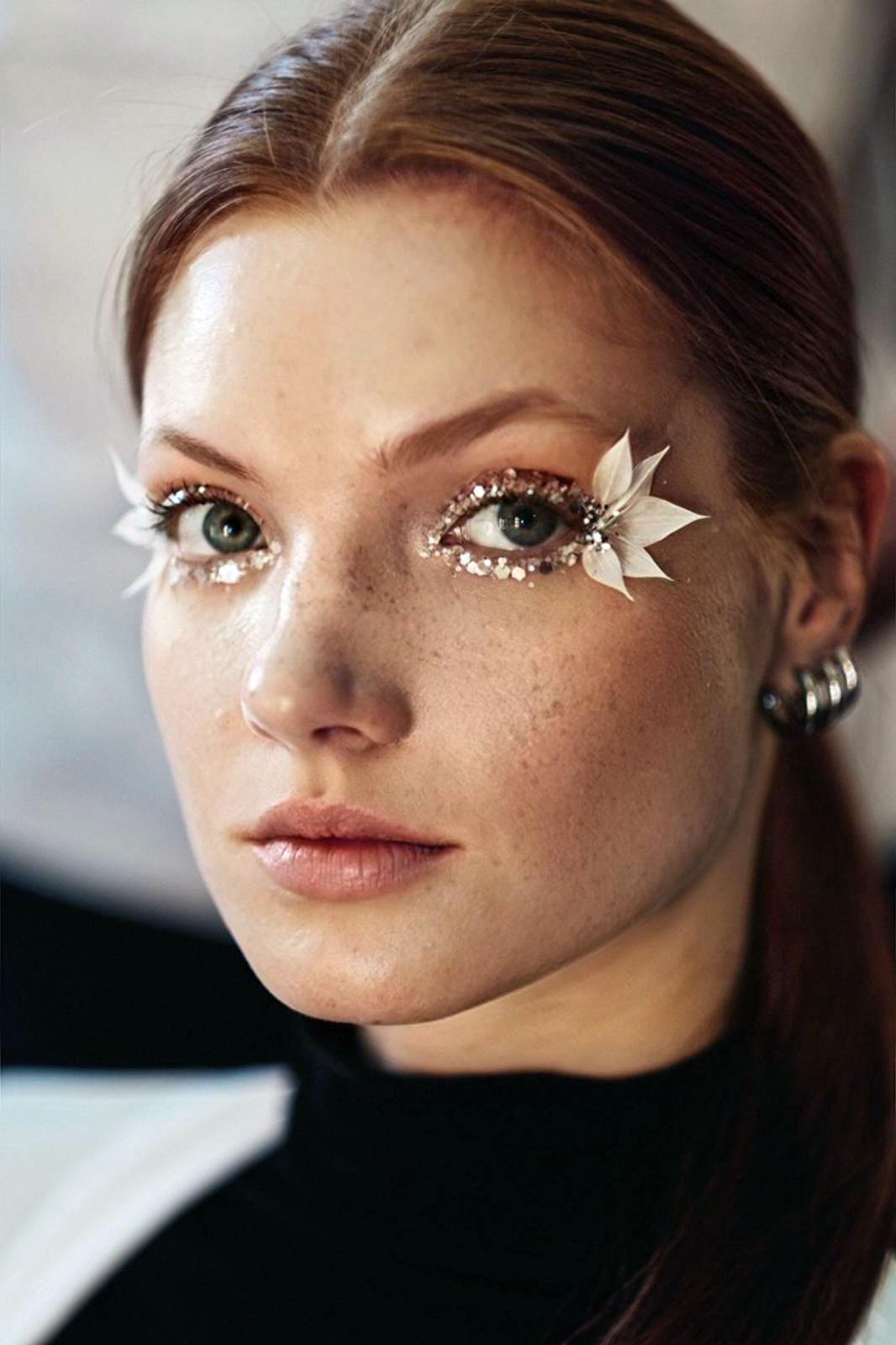 Kennzeichnend für den ersten Make-up Look ist die „Sparkling Eyeline“ mit Glitzerpigmenten und „White Leaves“ aka weißen Blättern, die aufwändig zu einer floral anmutenden Form am äußeren Augenwinkel appliziert werden. Zu schön und definitiv nachahmenswert. Also loslos!