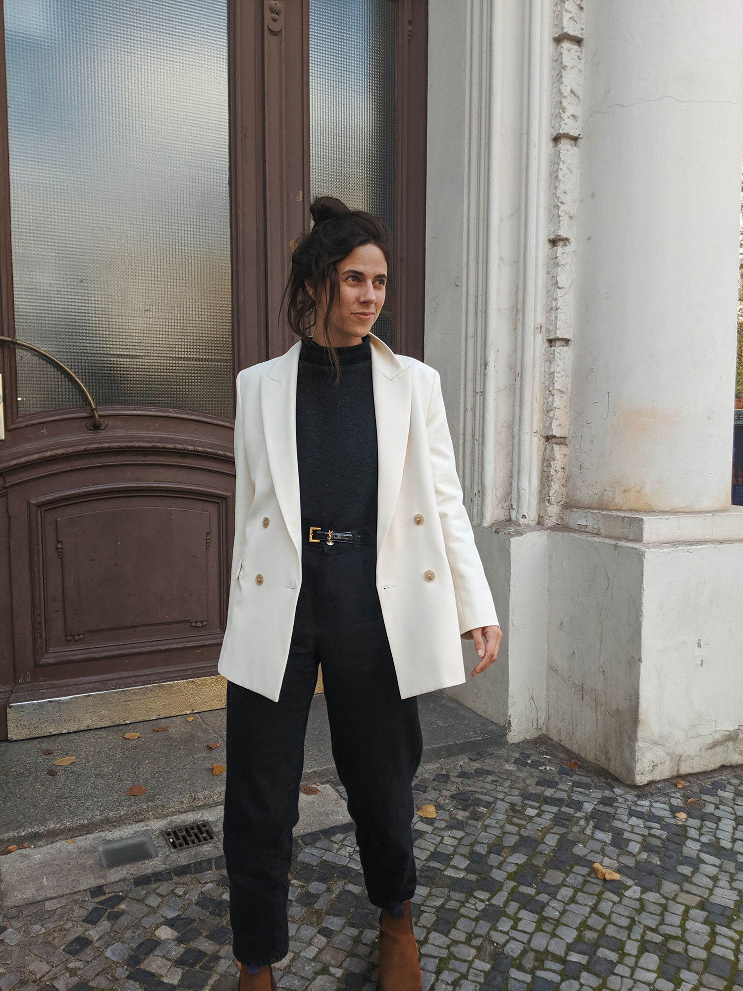 Blazer: Samsøe Samsøe, Jeans: Mango, Pullover: Filippa K., Gürtel: Saint Laurent, Boots: Eytys (ausverkauft)