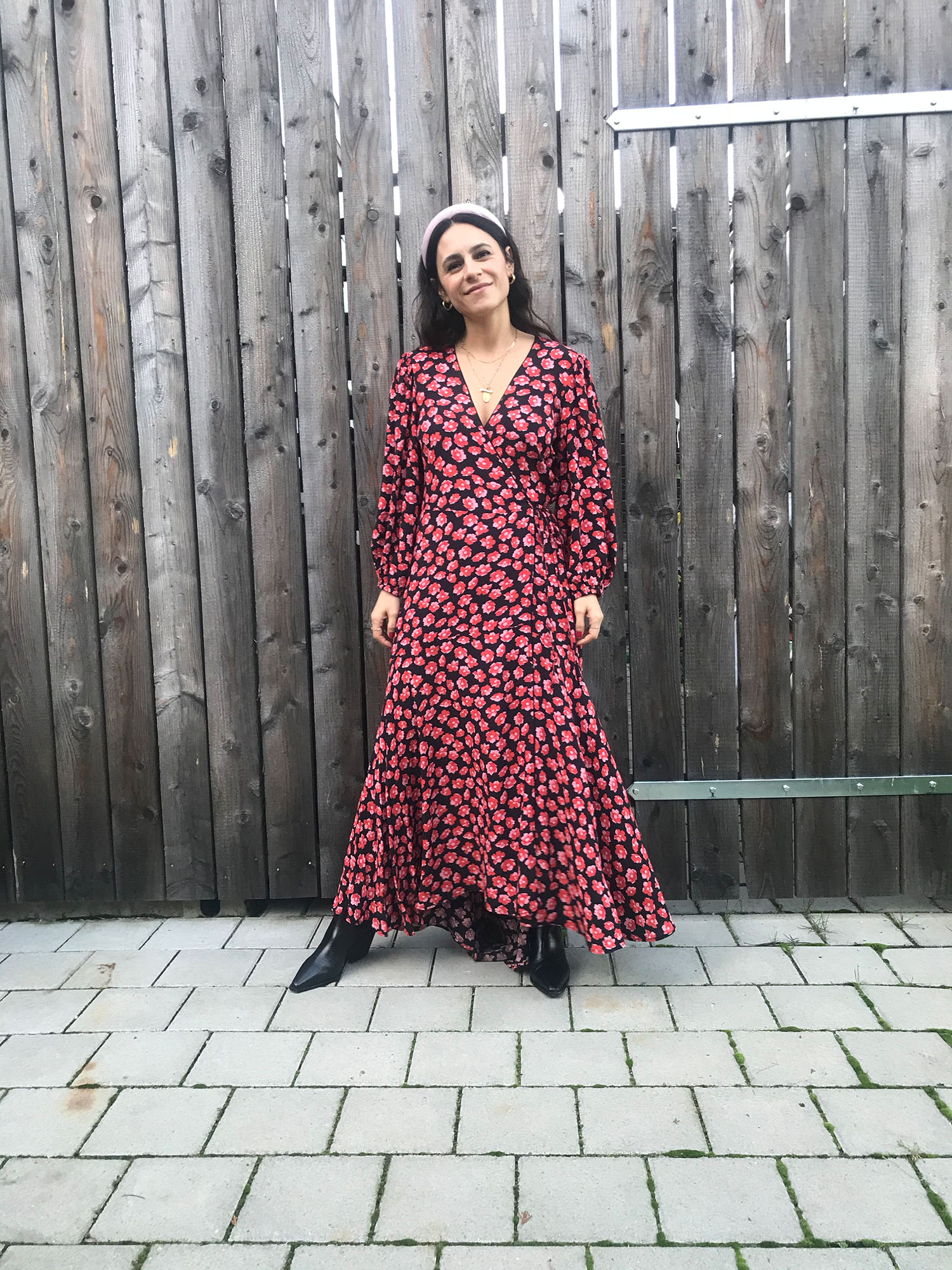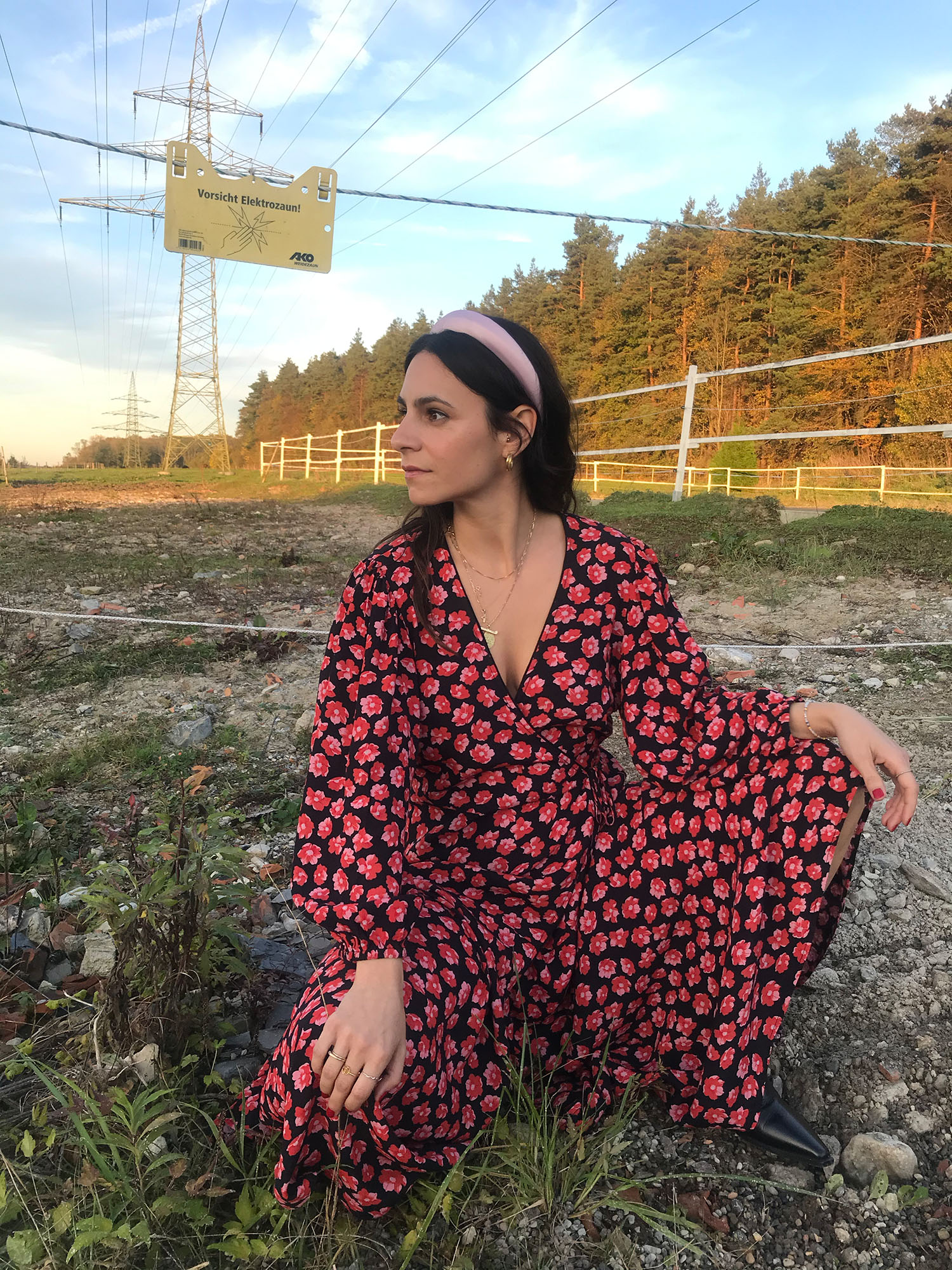 Blumenkleid Ganni (alt, ähnlich hier), Stiefel von Aeyde, Haarreif von Zara