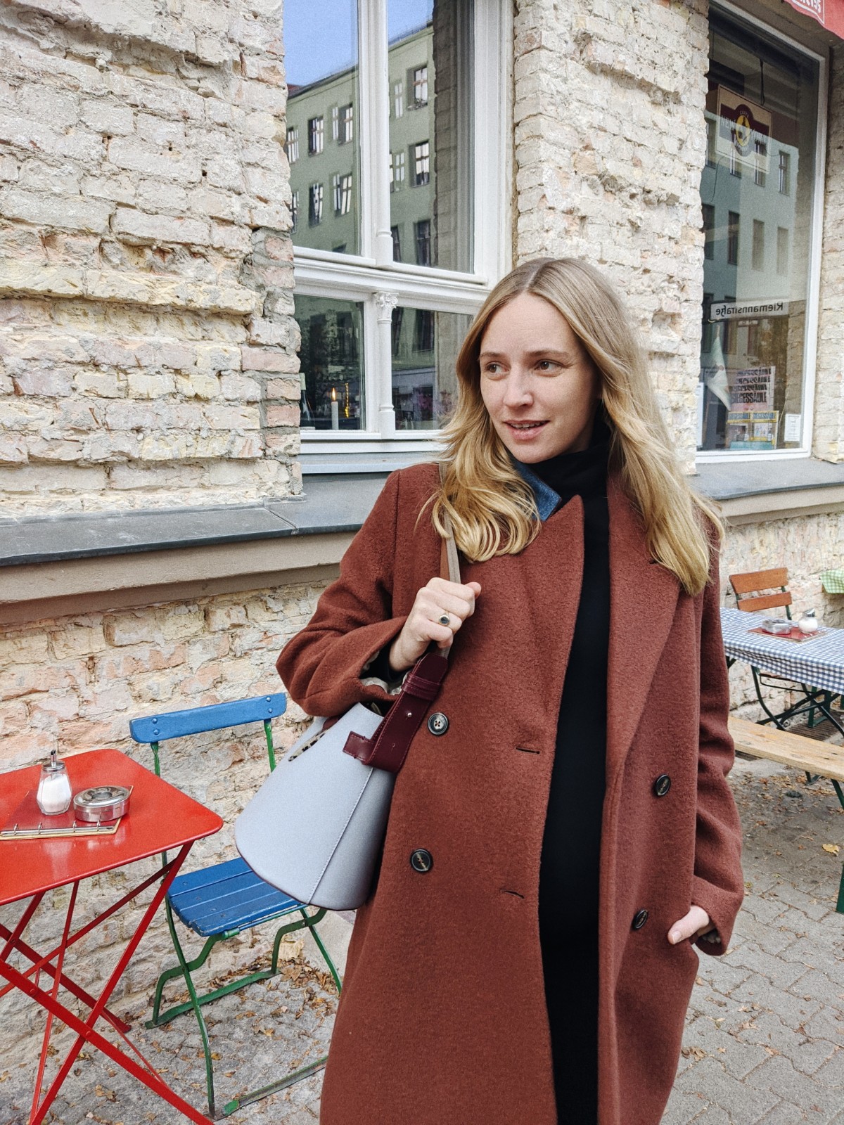Rollkragen von Wolford , Rock von Topshop (alt), Mantel von Closed, Schuhe von & Other Stories, Tasche von Ganni