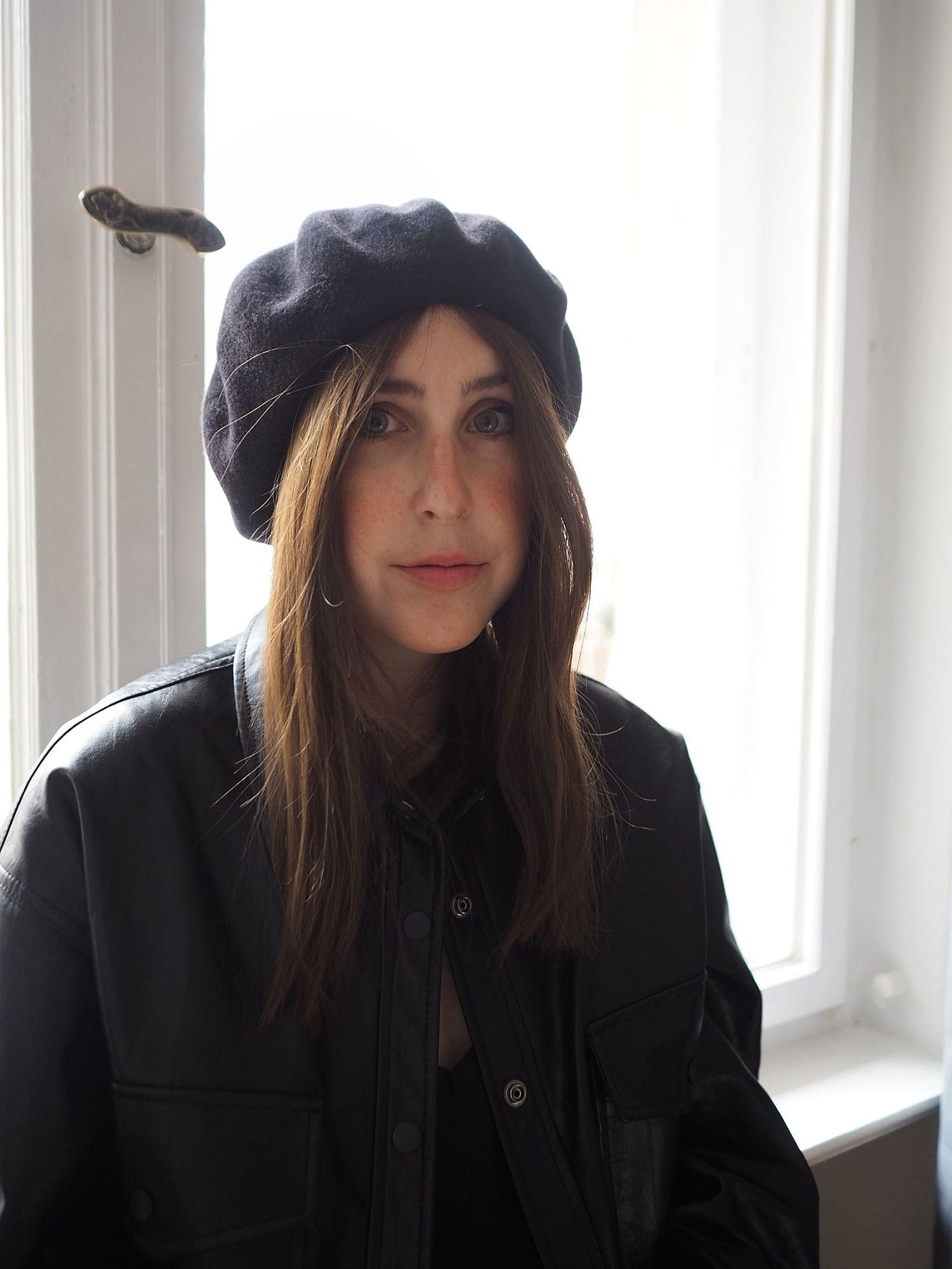 rechts: Shirt aus veganem Leder von Pixiemarket, alte Basktenmütze