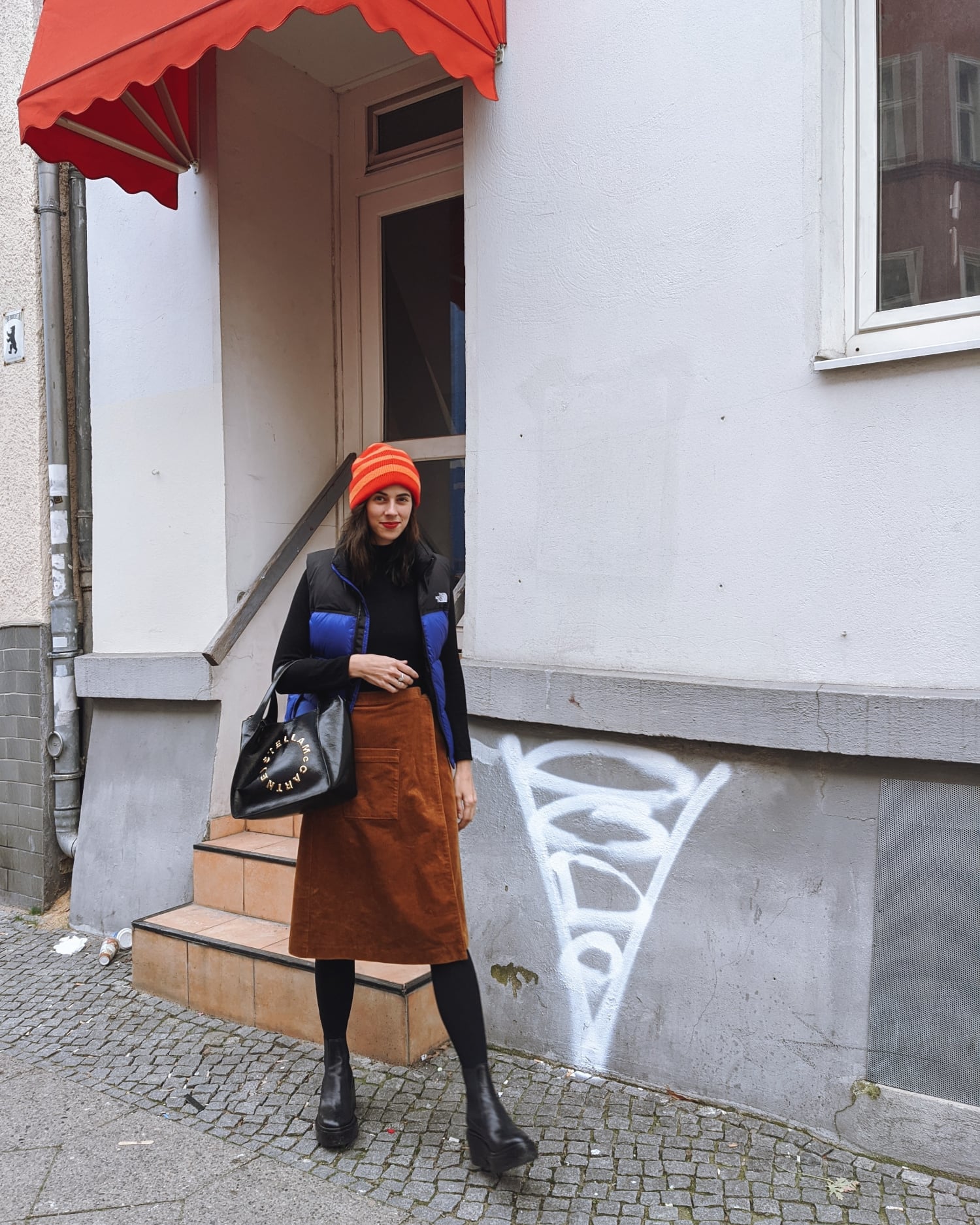 Mütze: Acne Studios, Pullover: Edited the Label, Rock: J.W. Anderson x Uniqlo, Boots: Margiela via Vestiaire Collective, Weste: The North Face, Tasche aus veganem Leder: Stella McCartney