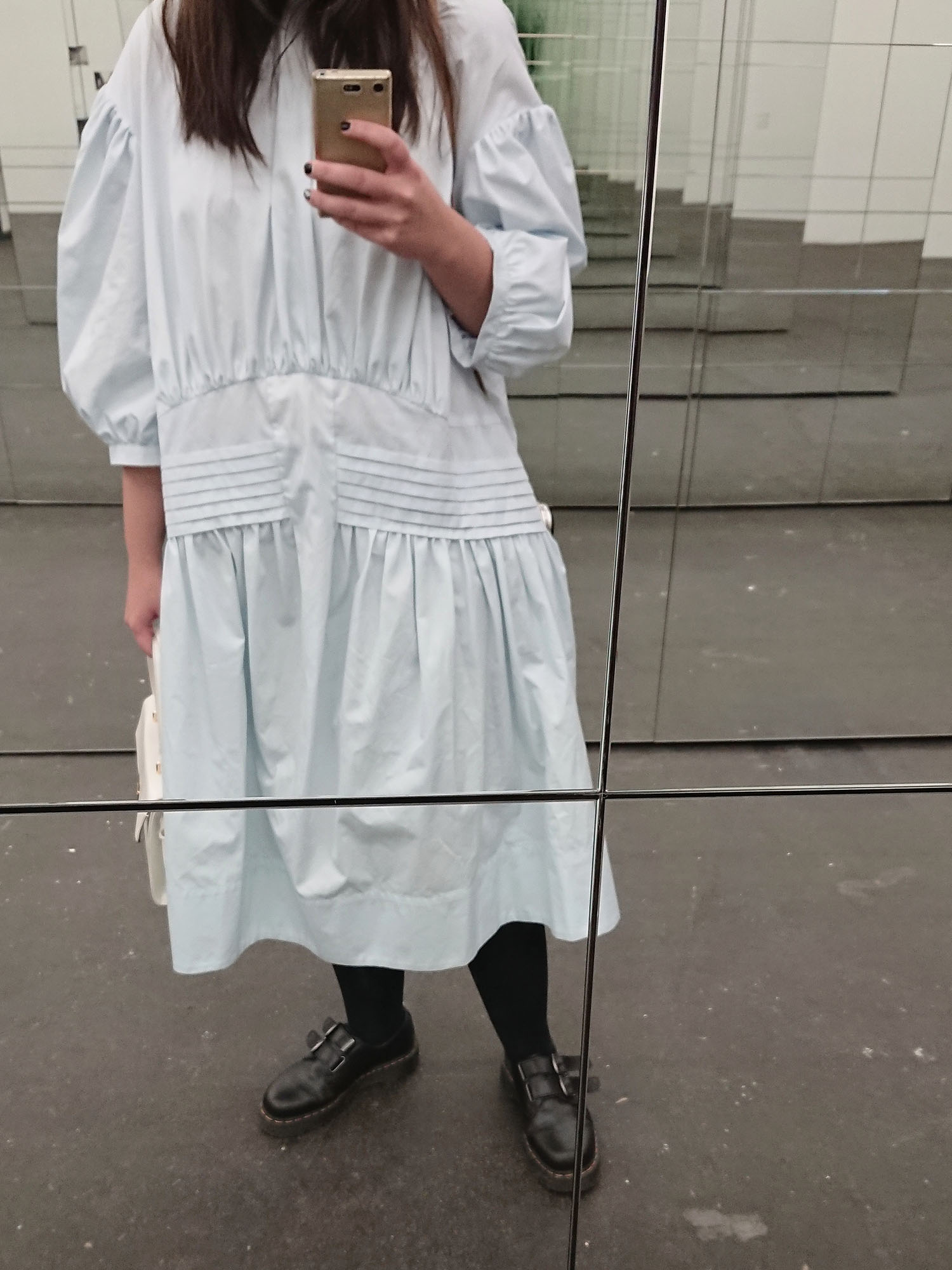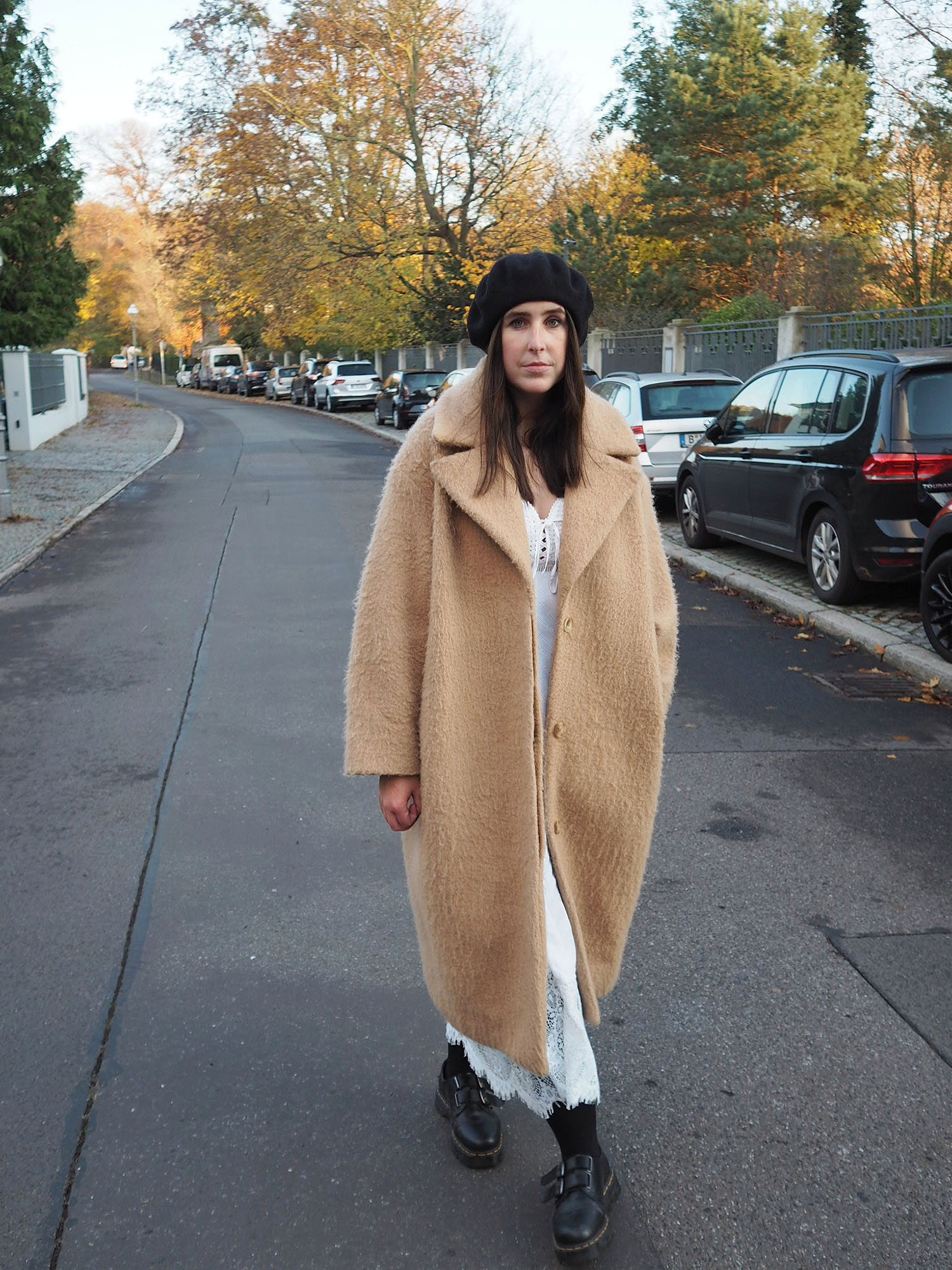 Kleid von Mcq by Alexander McQueen (alt, aus einem Outlet), Schuhe von Dr. Martens, Mantel von Weekday (alt), Beret alt