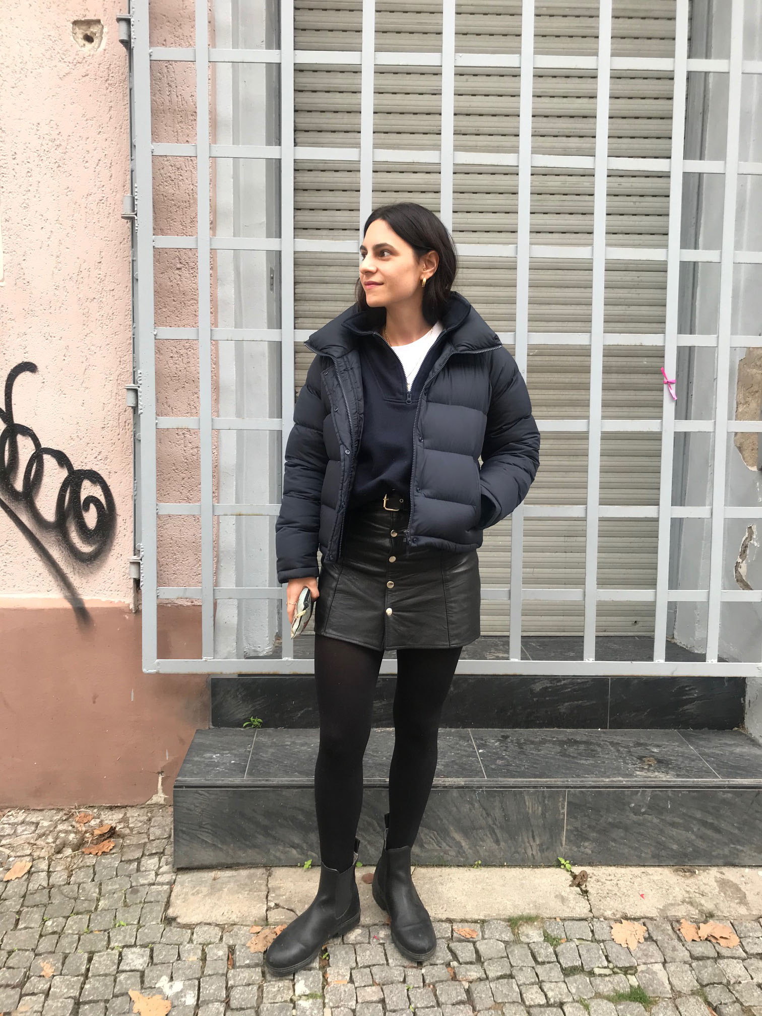 Jacke: Uniqlo x JW. Anderson (von letztem Jahr, ähnlich hier), Pullover alt (ähnlich hier), Secondhand Lederrock, Stiefel von einem Reiterhof bei meinen Eltern (ähnlich hier)