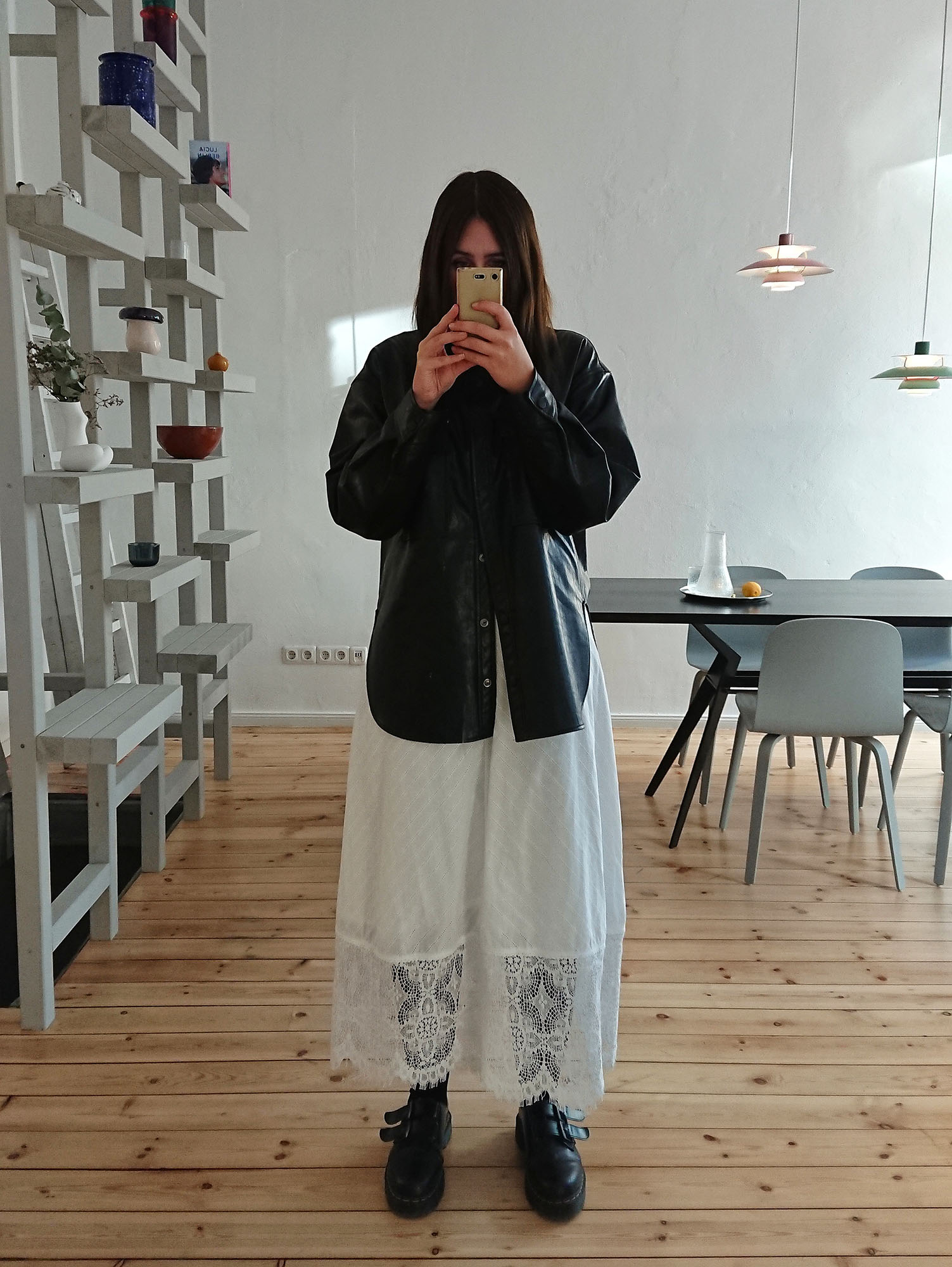 Shirt aus veganem Leder von Pixiemarket, Kleid von Mcq (Outlet), Schuhe von Dr. Martens