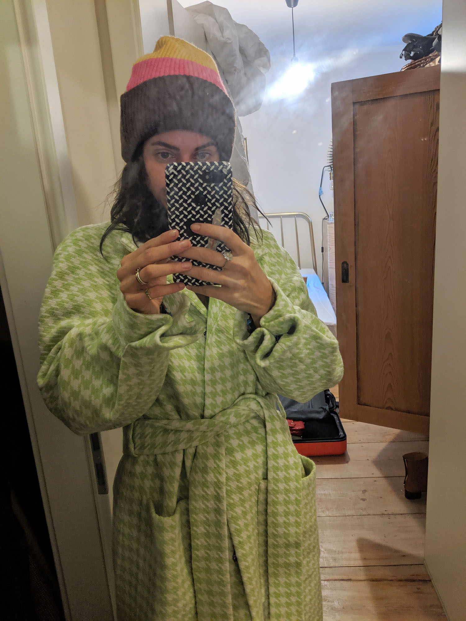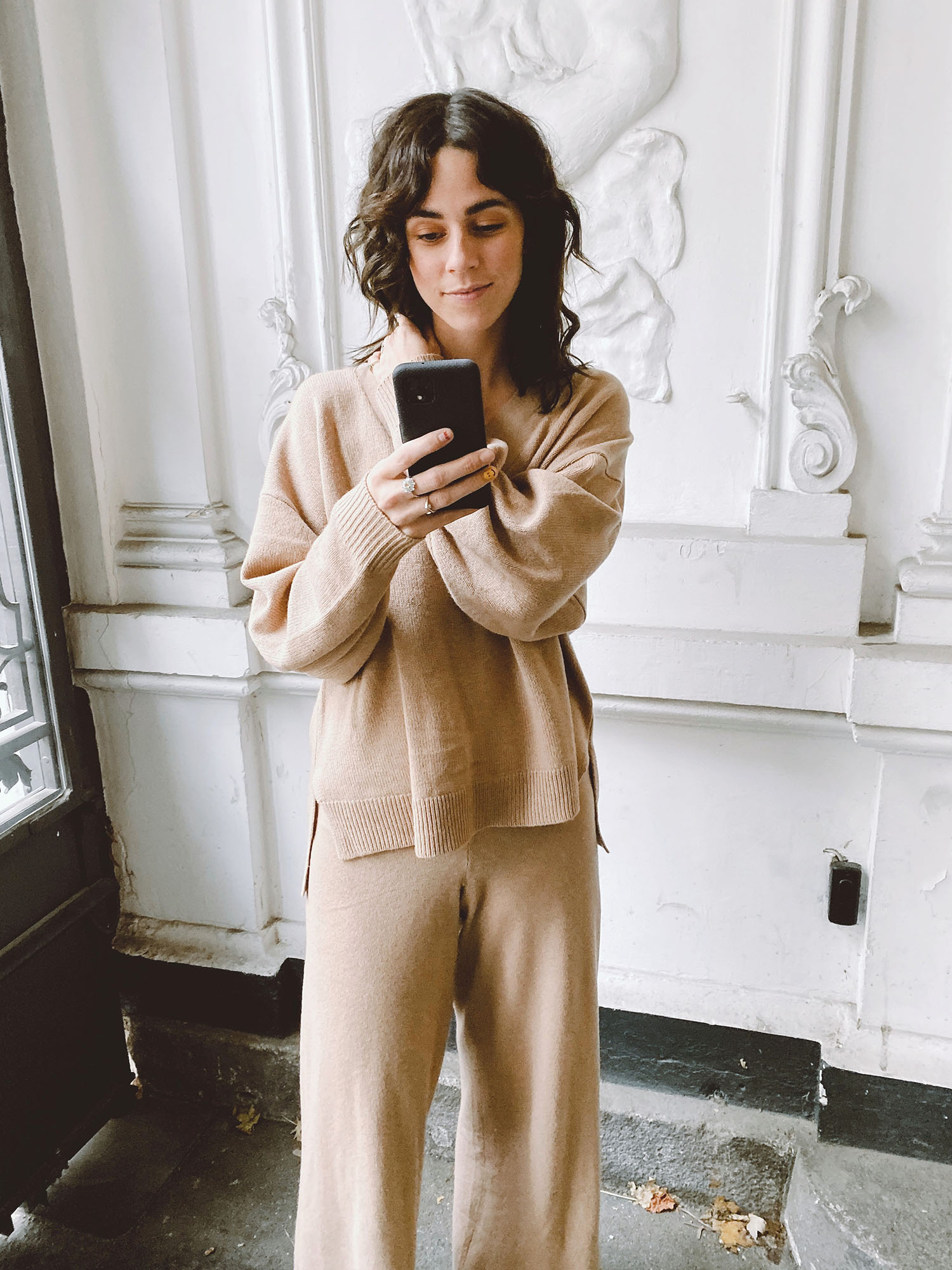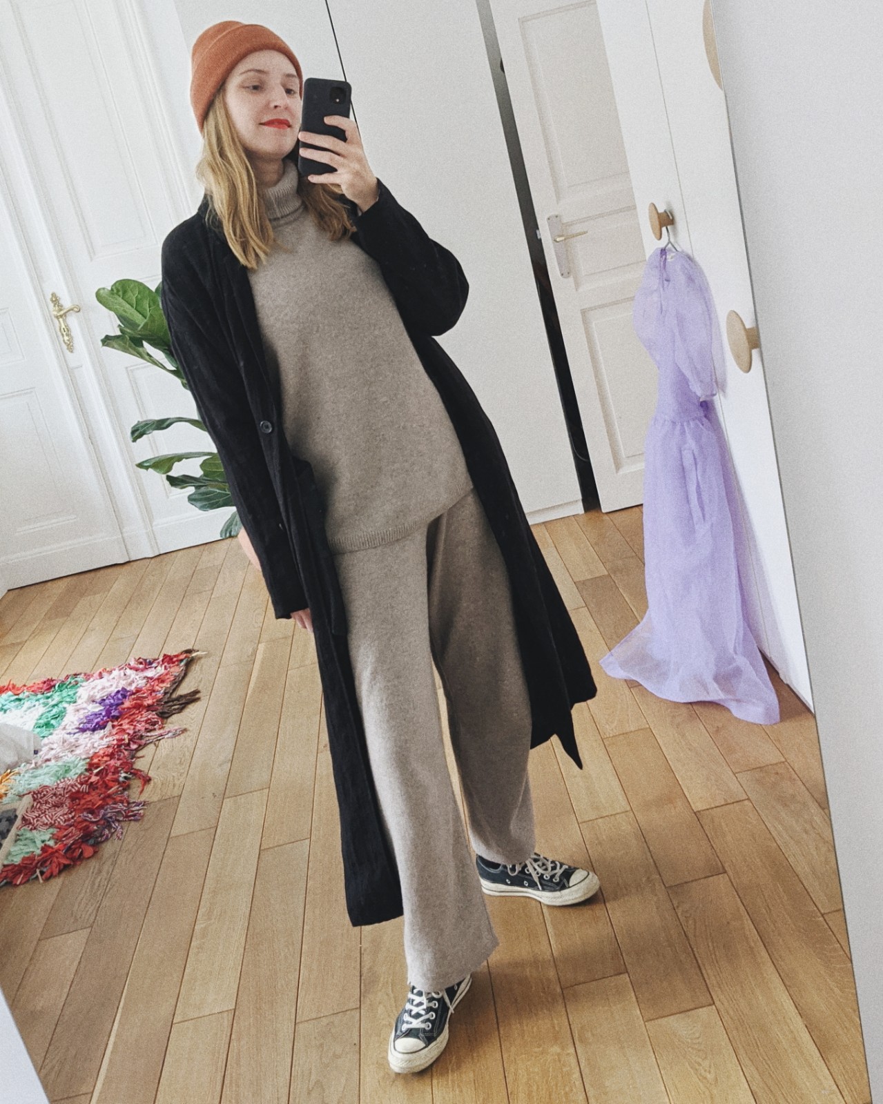 Mantel: Weekday (alt), Zweiteiler: Rollkragen und Hose von Arket, Schuhe: Chucks 70s, Kleid im Hintergrund: Baum & Pferdgarten