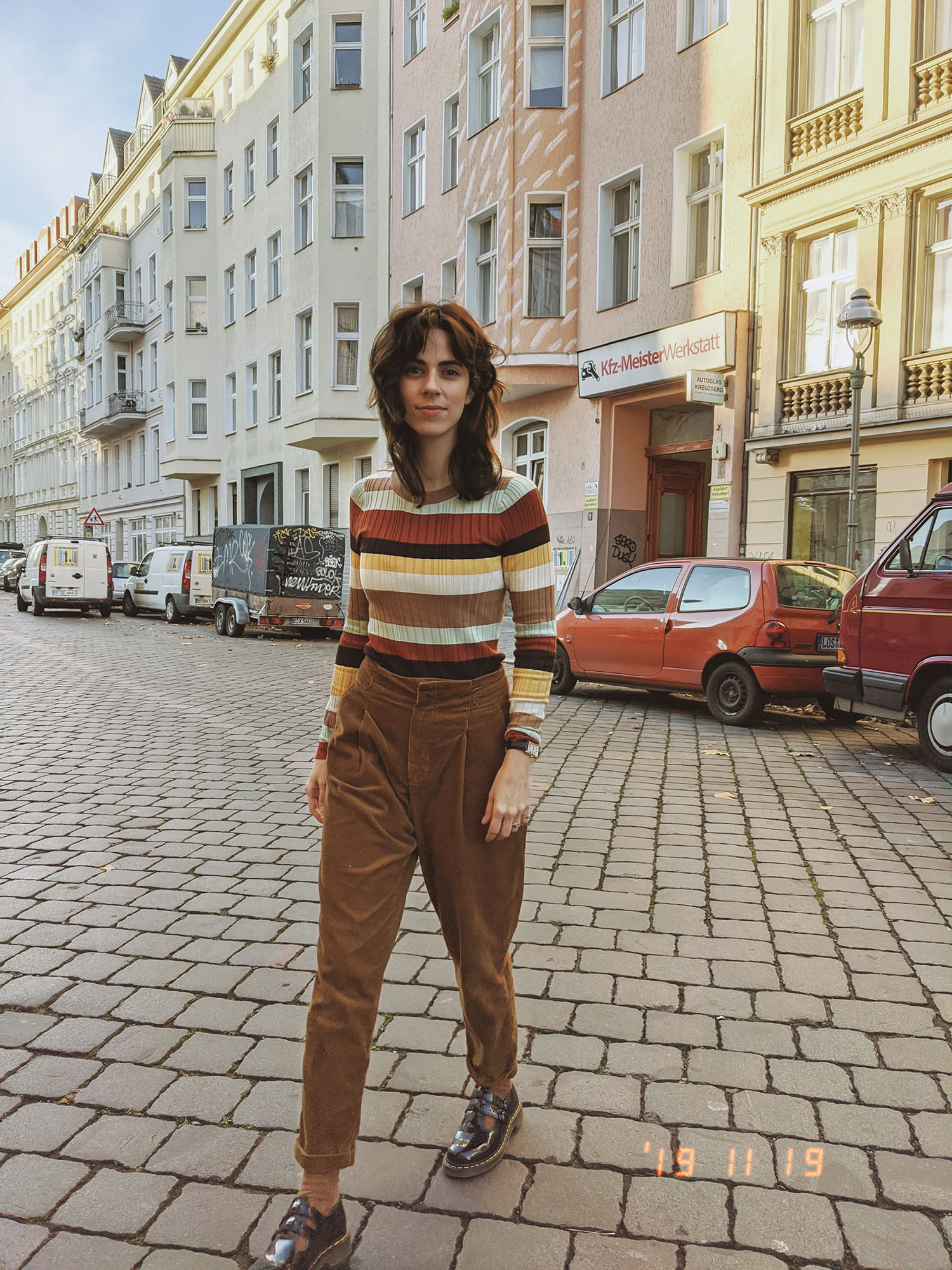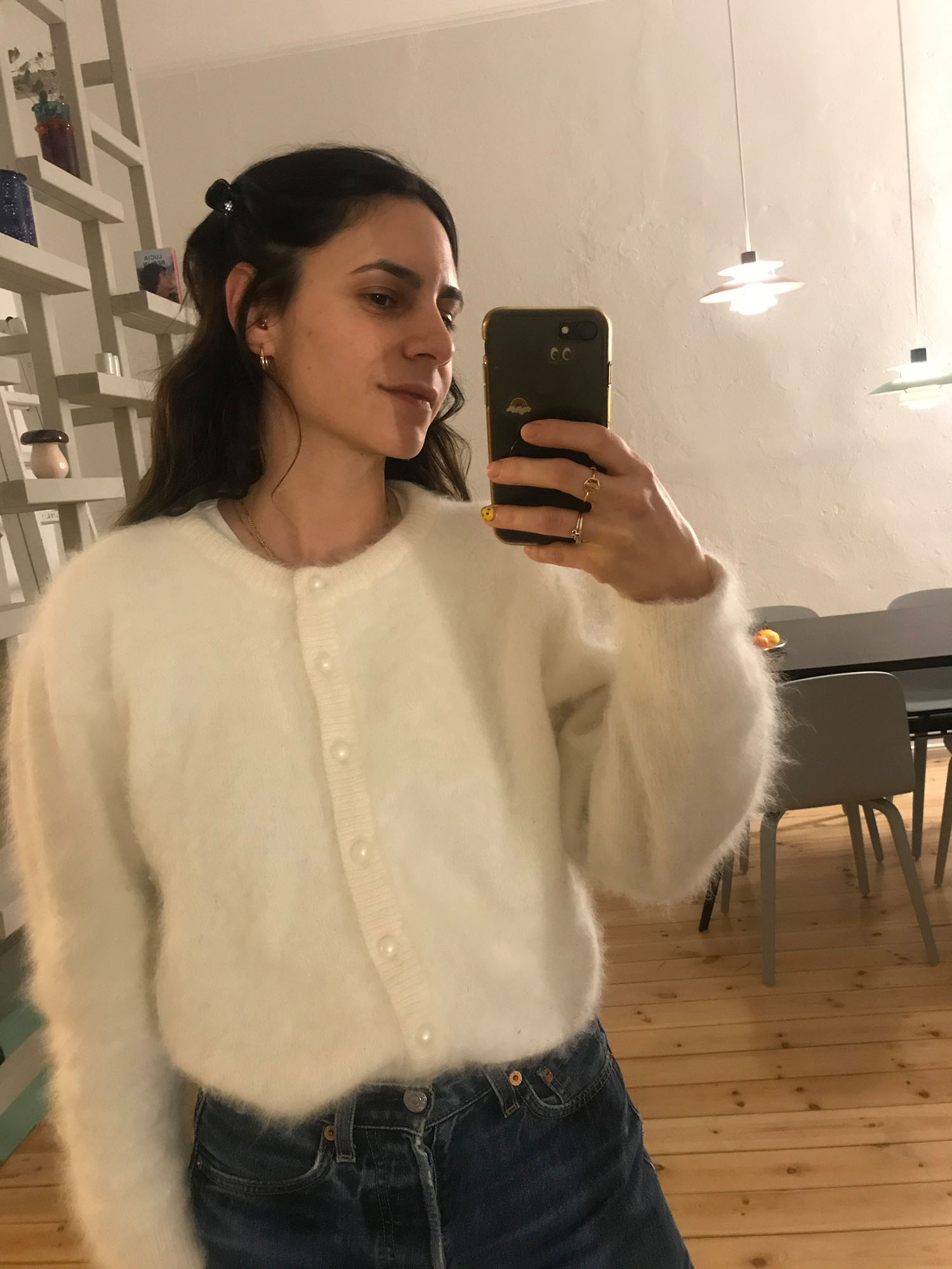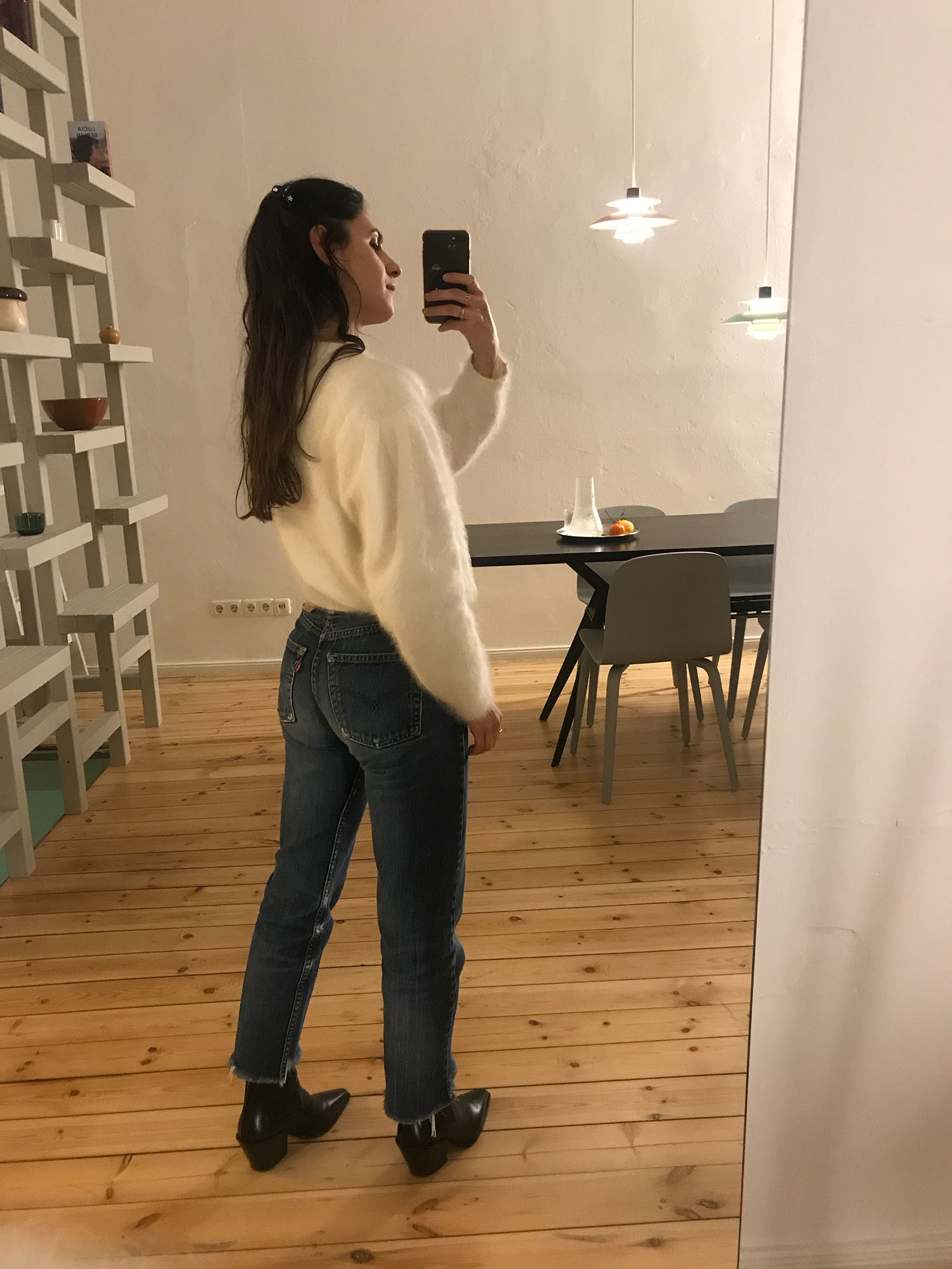 Strickjacke von meiner Mama, Hose: Secondhand Levis 501, Boots: Aeyde, Haarspange: Hondos Center
