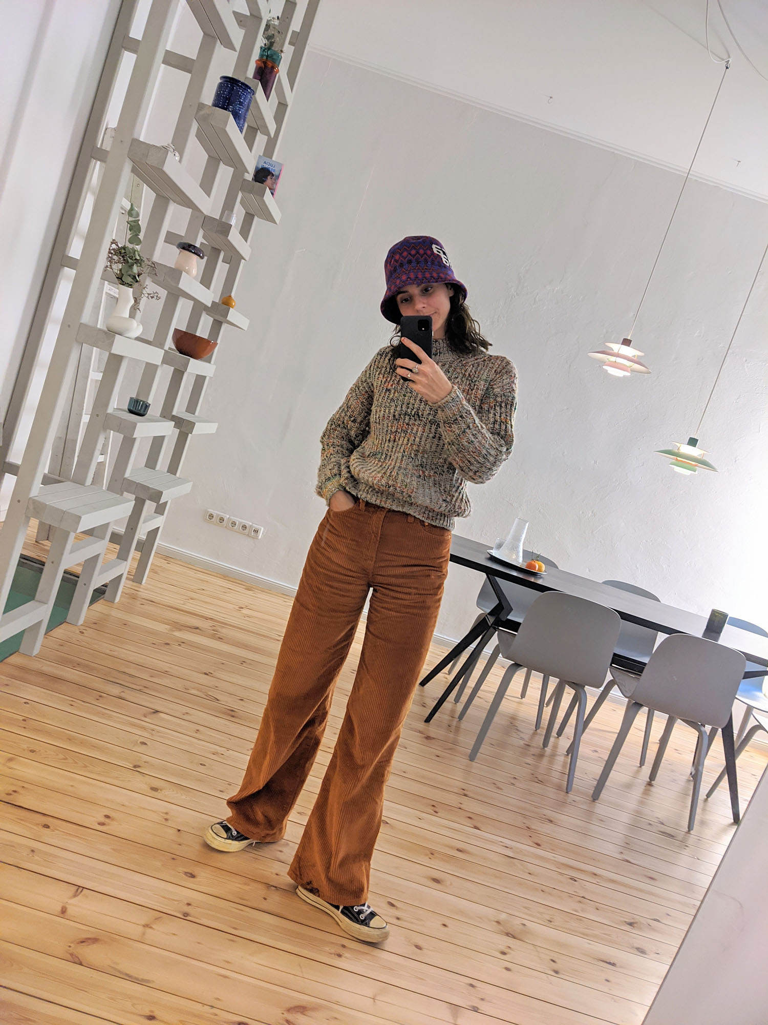 Strickjacke von meiner Mama, Hose: Secondhand Levis 501, Haarspange: Hondos Center