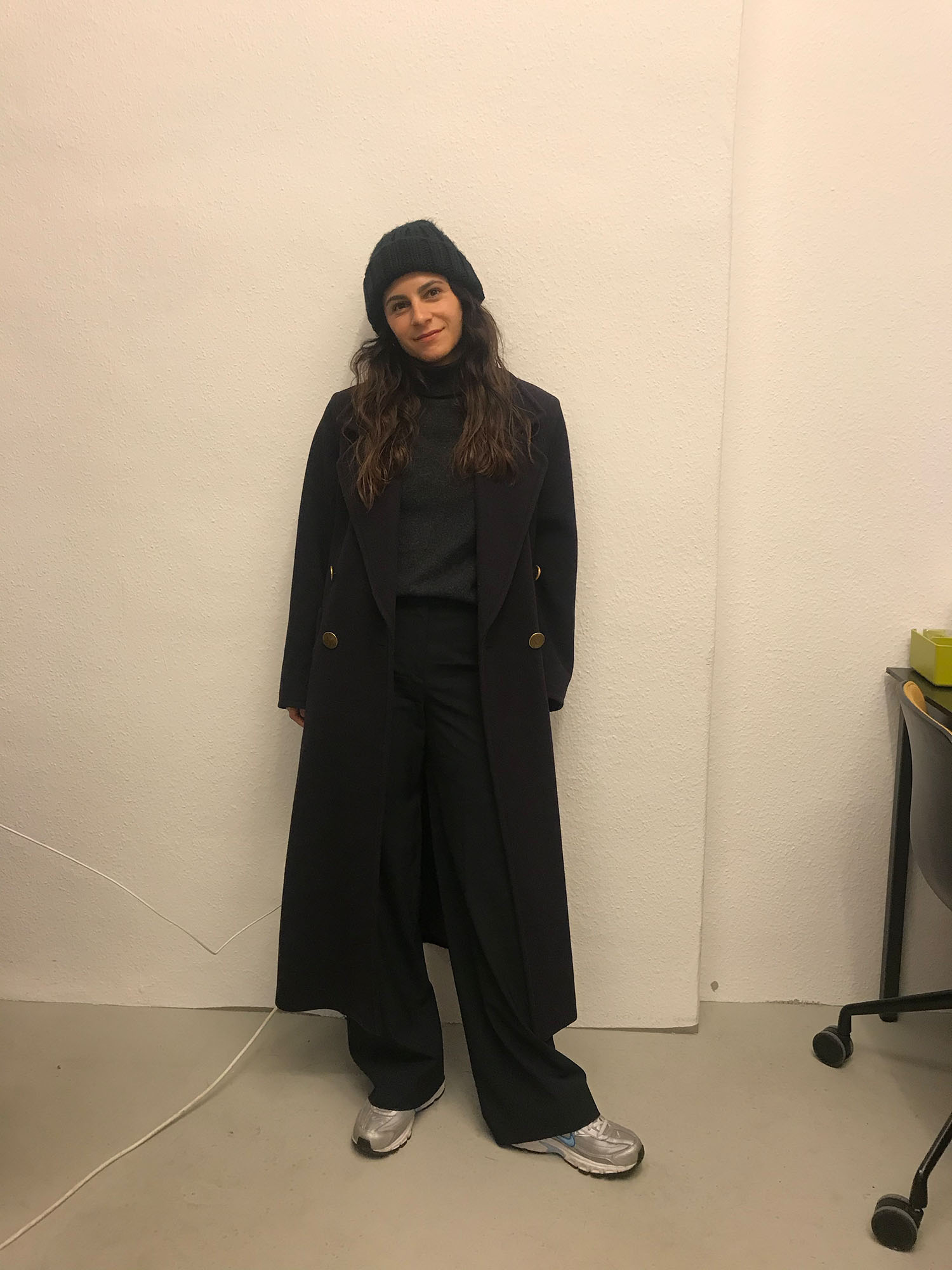 Mantel: Secondhand, Rollkragenpullover: United Colors of Benetton, Hose: Secondhand Jil Sander via Neuzwei, Mütze: Uniqlo, Sneaker: Nike Initiator