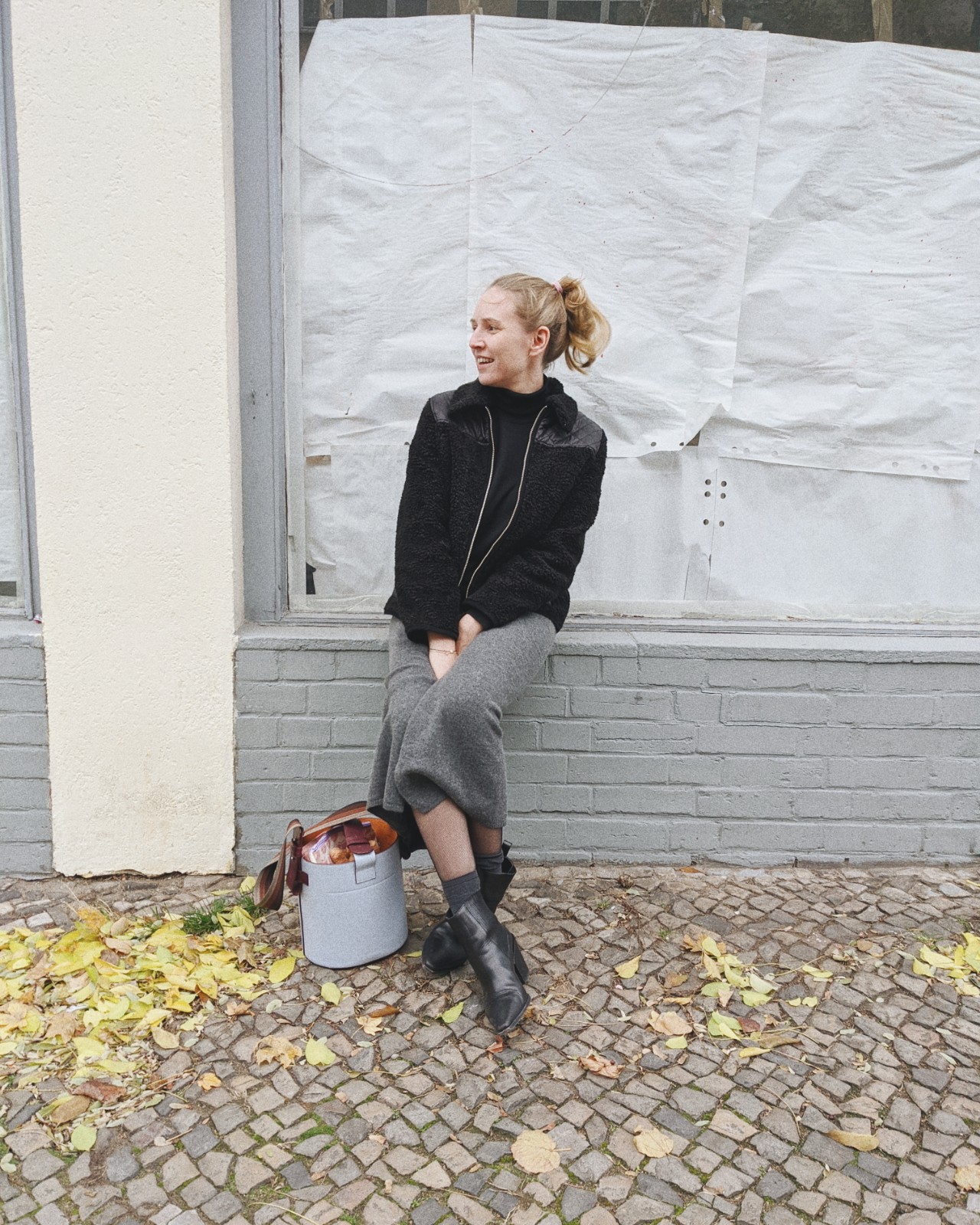 Jacke: Barbour x Alexa Chung, Rollkragen: Arket, Rock: Edited the Label, Schuhe: Aeyde, Tasche: Ganni
