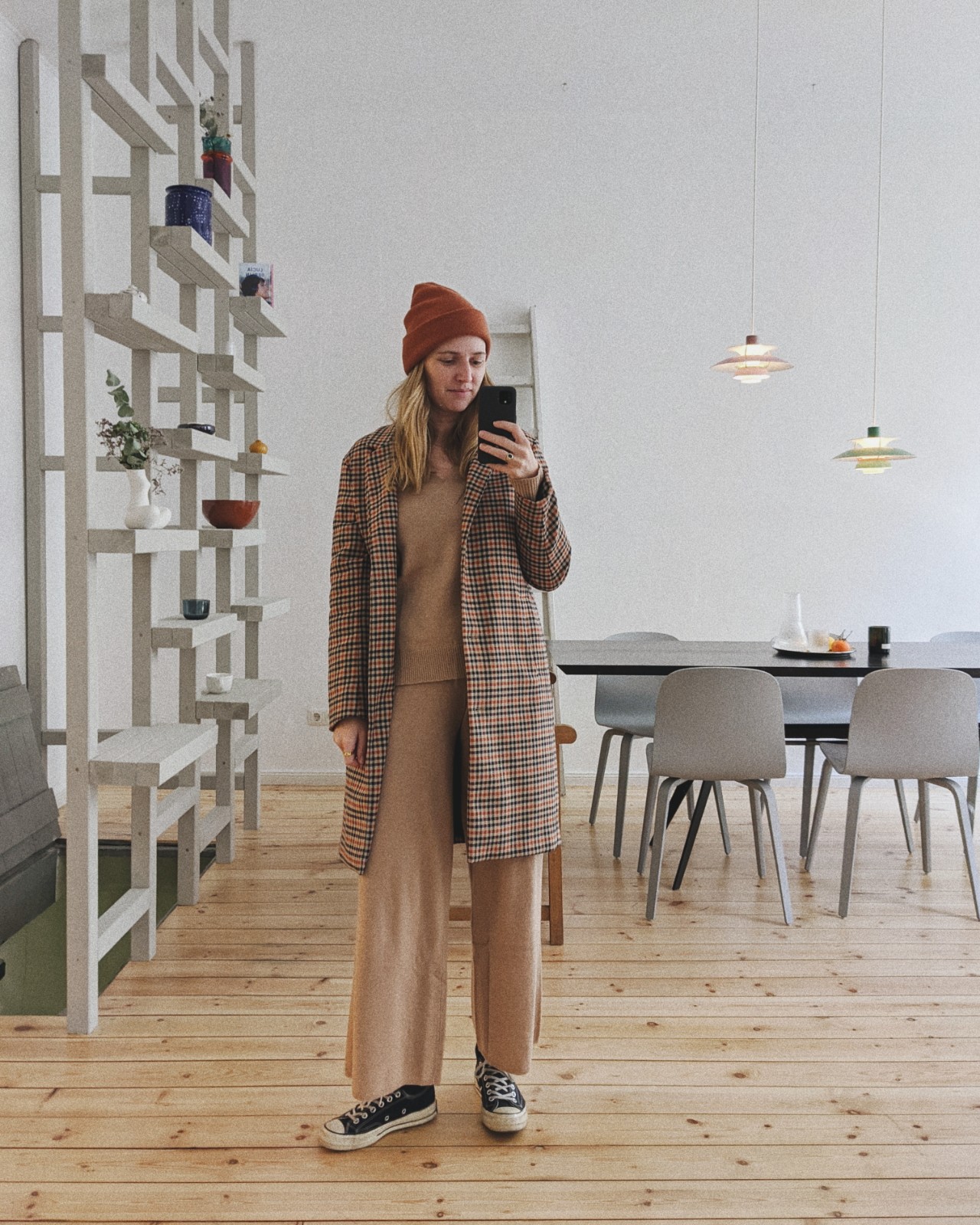 Karierter Mantel: Closed (ausverkauft), Zweiteiler: Hose und Pulli von Edited the Label, Schuhe: Chucks 70s