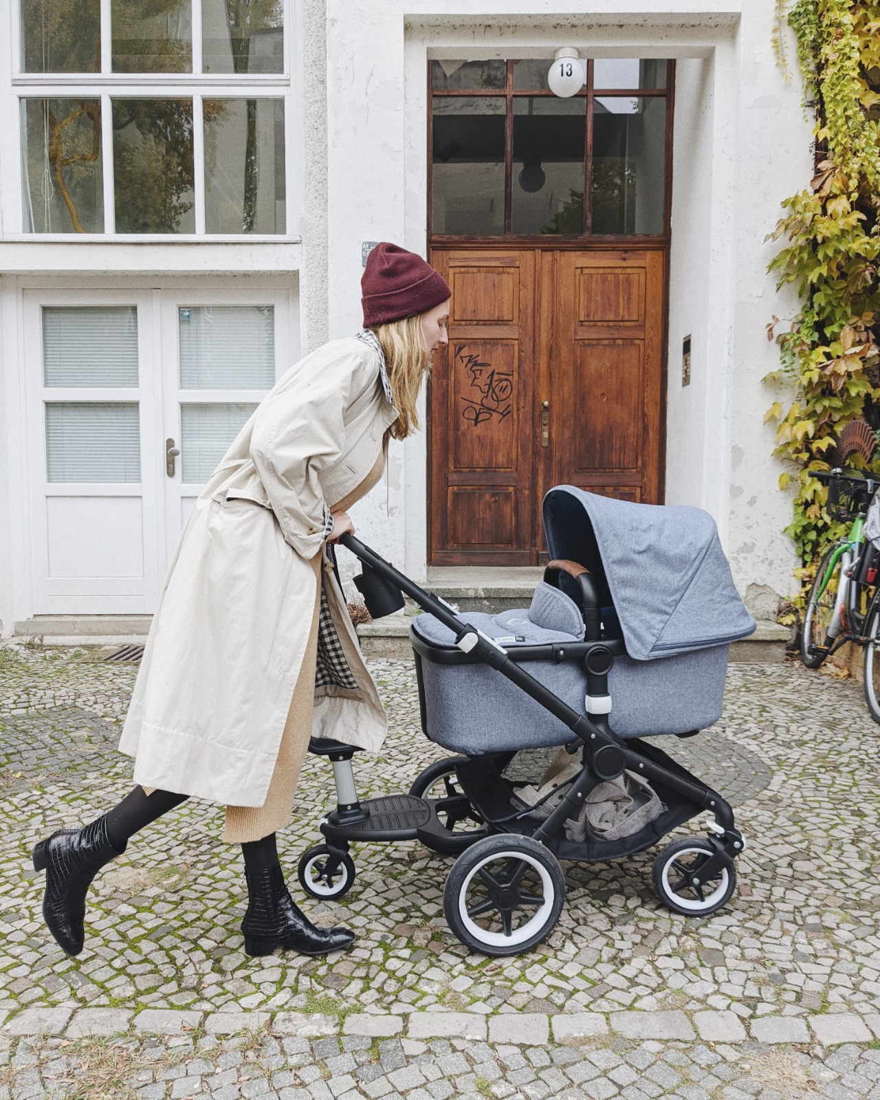Mantel: Barbour x Alexa Chung, Kleid: Edited the Label, Schuhe: Aeyde, Kinderwagen: Bugaboo Fox